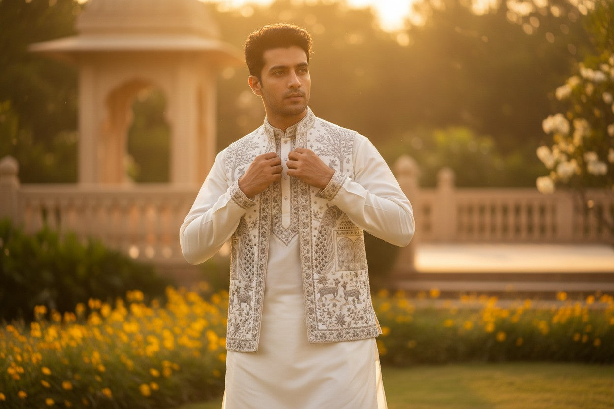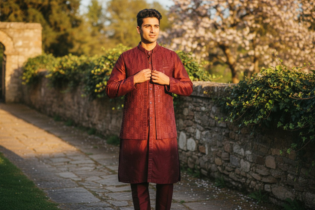 Complete coordinated sets with kurta, pajama, and matching vest — crafted for weddings, festive events, and elegant celebrations.