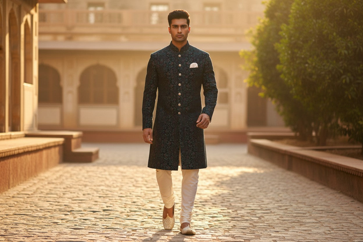 Black Teal Brocade Achkan for Men | Regal Wedding & Festive Wear