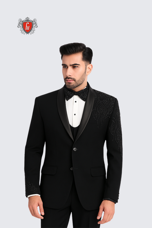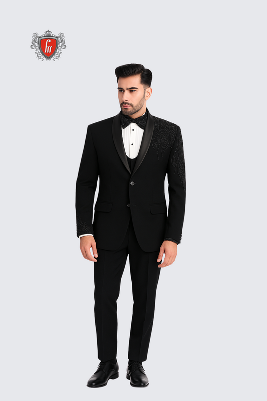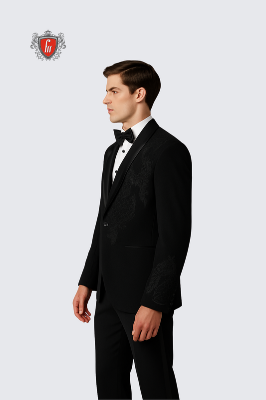 Men’s Black Embroidered Tuxedo – Elegant Formalwear for Weddings & Parties