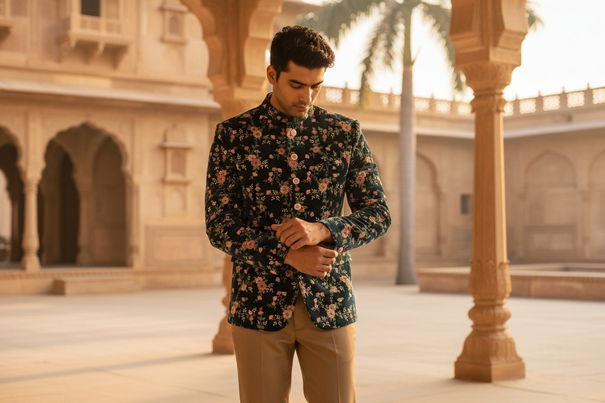 Green Floral Velvet Jodhpuri Suit – Elegant Wedding Wear
