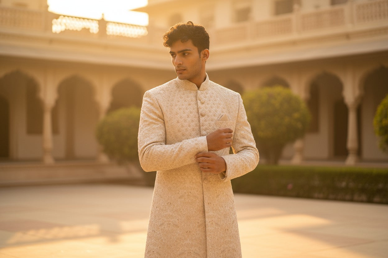 Ivory Hand-Embroidered Sherwani for Men – Luxurious Wedding Ensemble