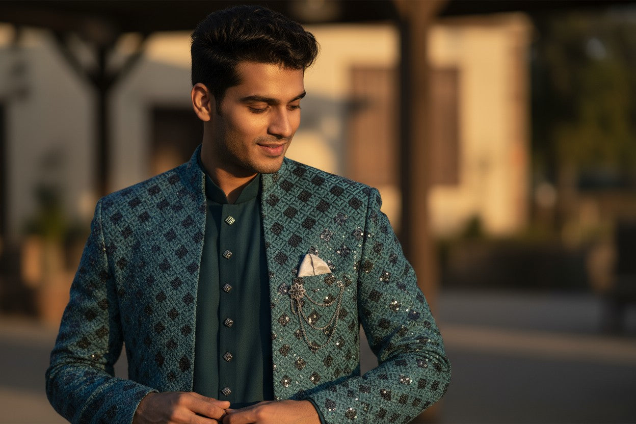 Teal Sequin Pattern Indo-Western Jacket Set for Men