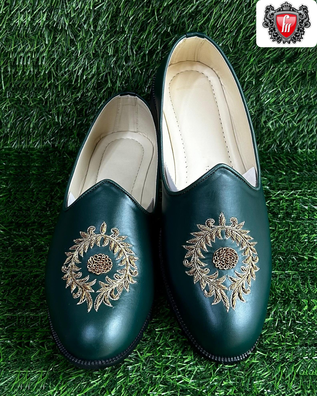 Men’s Bottle-Green Micro-Leather Heel Shoe with Hand Embroidery – Premium