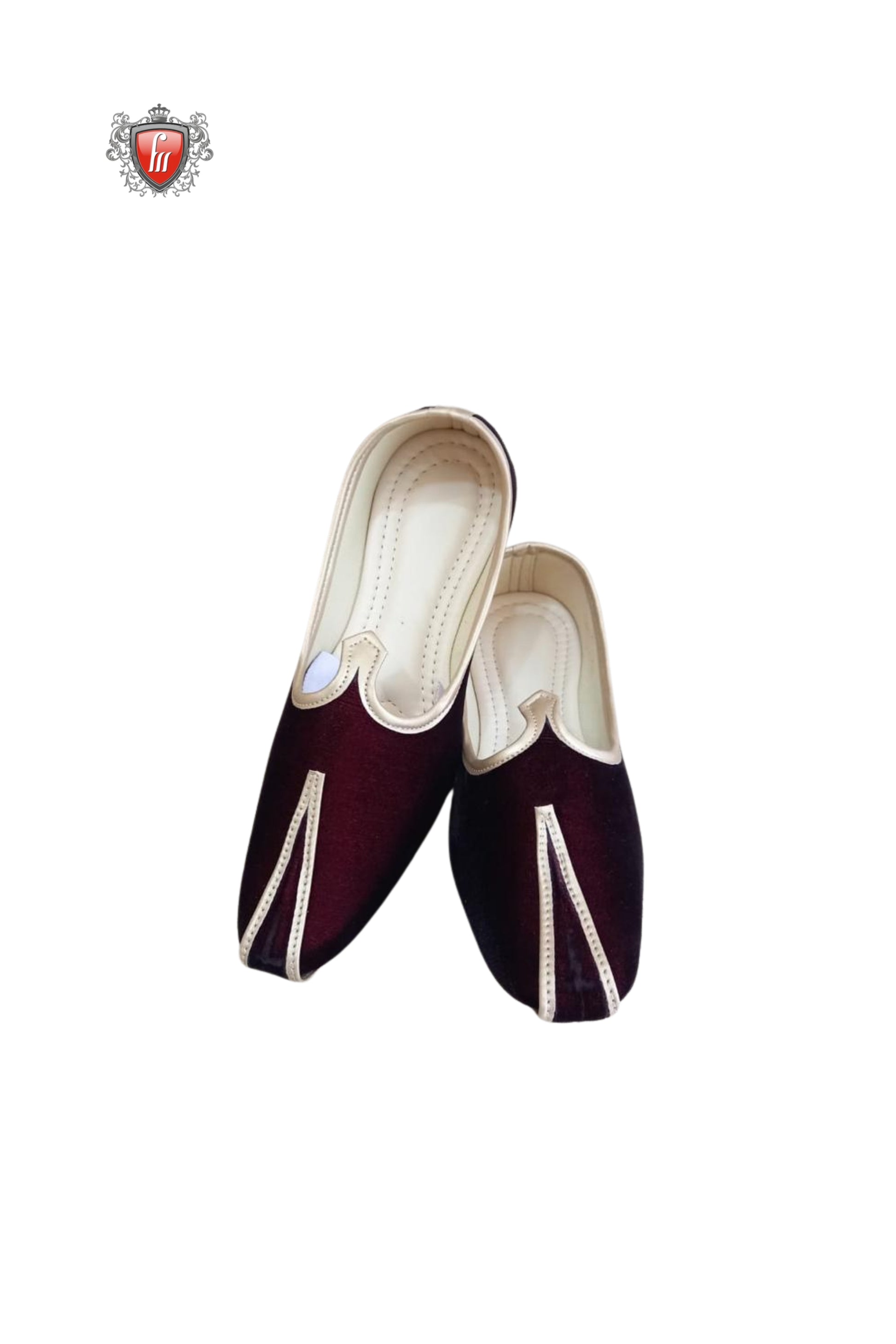 Step into timeless tradition with this maroon velvet jutti by Fabmark, designed to add a regal charm to your ethnic collection. The deep maroon shade combined with sleek golden piping creates a perfect balance of richness and sophistication. Crafted for comfort and durability, this jutti complements sherwanis, kurtas, and festive attire, making it an ideal choice for weddings, receptions, and cultural celebrations.
