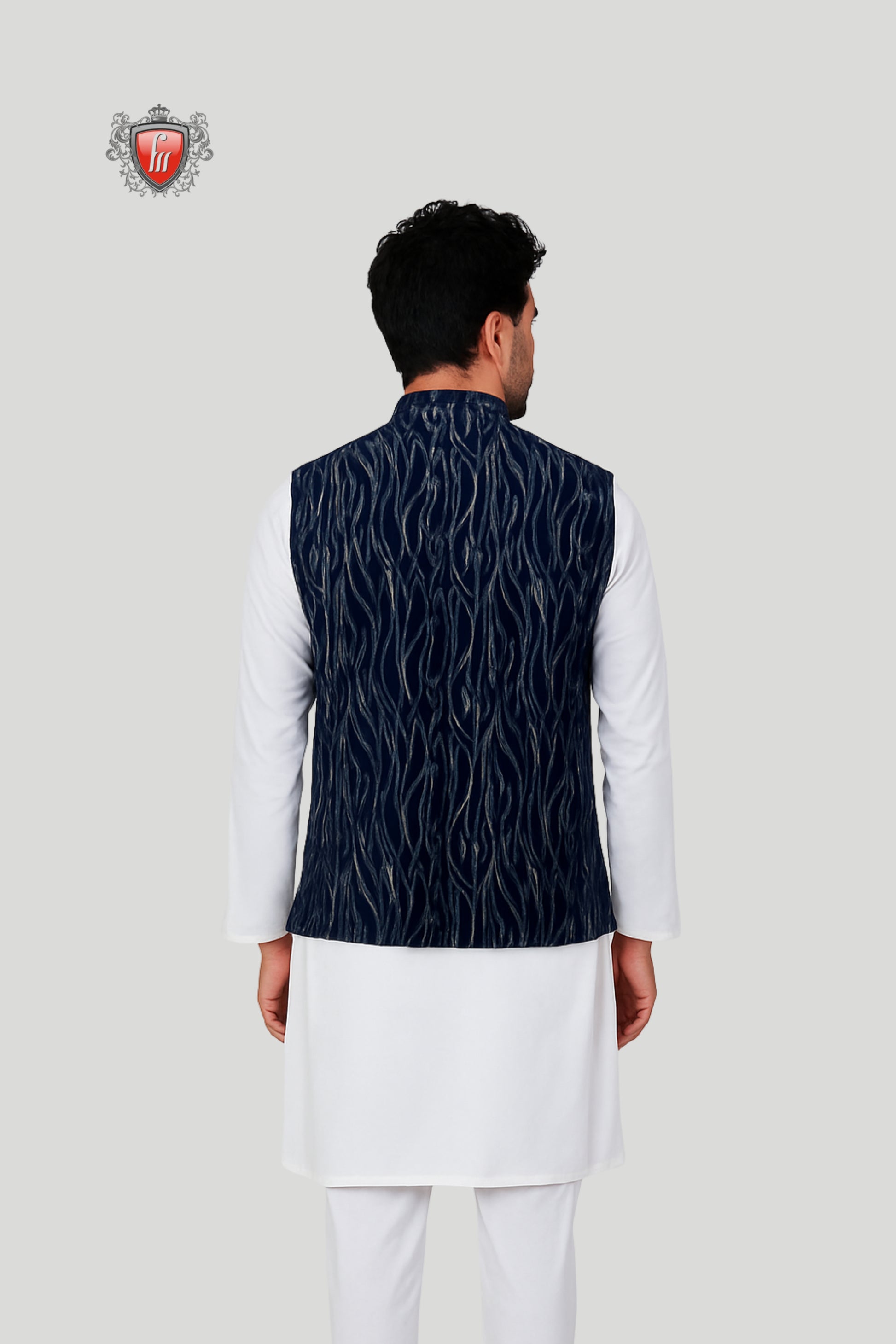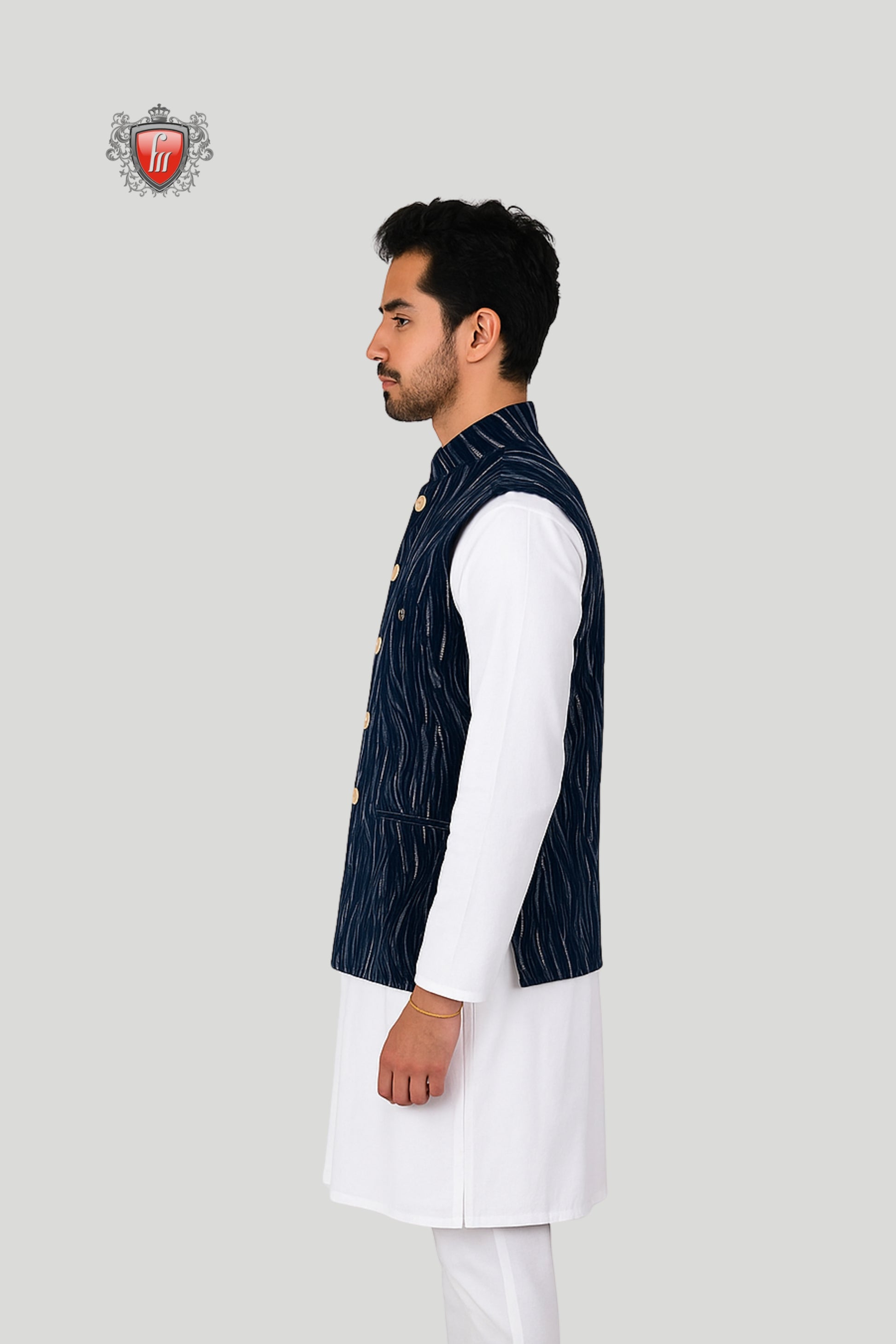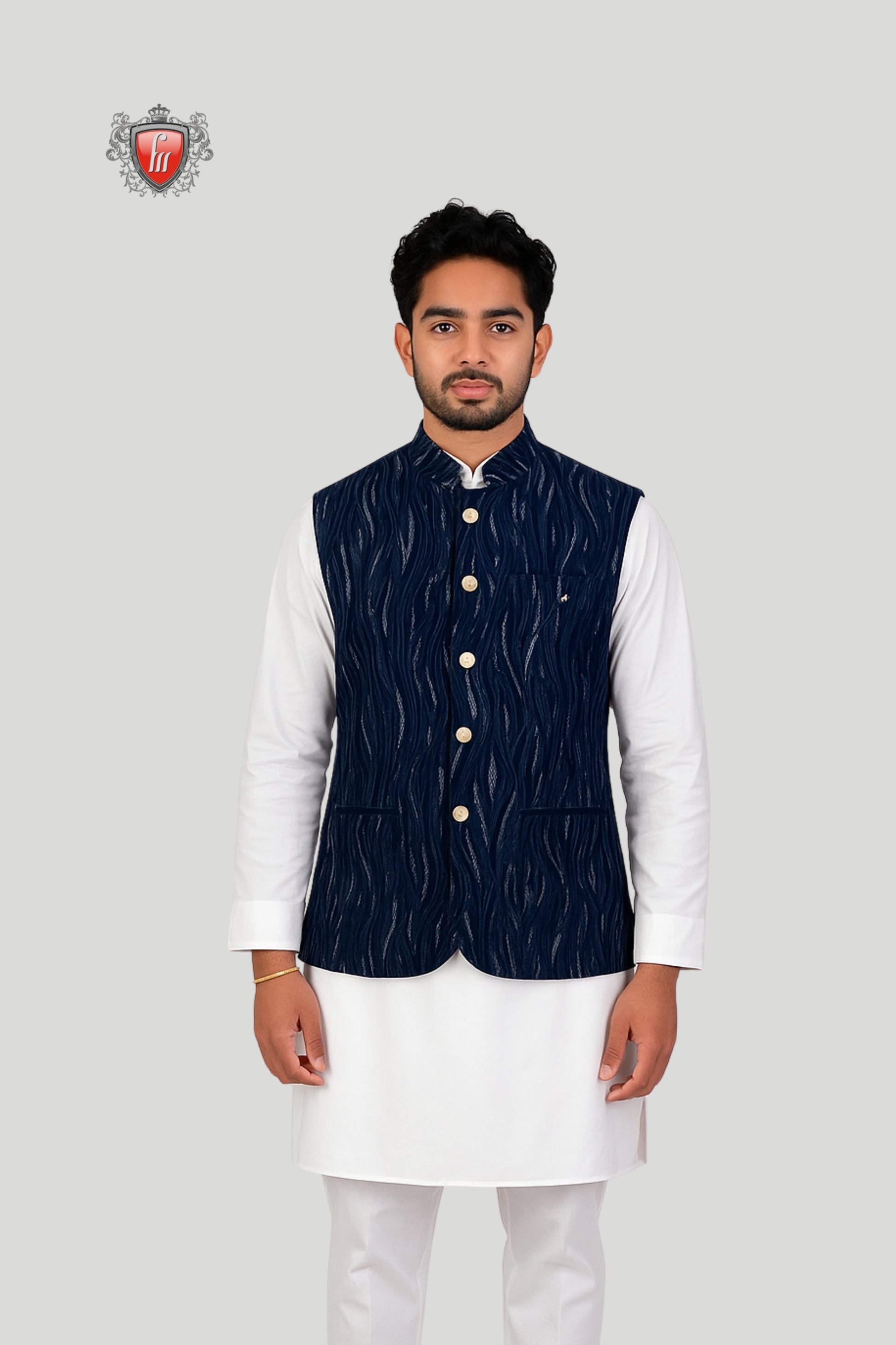 This navy blue waistcoat stands out with its elegant wave-textured pattern, adding a dynamic and stylish touch to traditional attire. Designed with a mandarin collar, wooden buttons, and practical welt pockets, it brings together contemporary design with classic tailoring. Perfect for weddings, festive events, and cultural gatherings, this waistcoat ensures a striking and modern ethnic appearance.