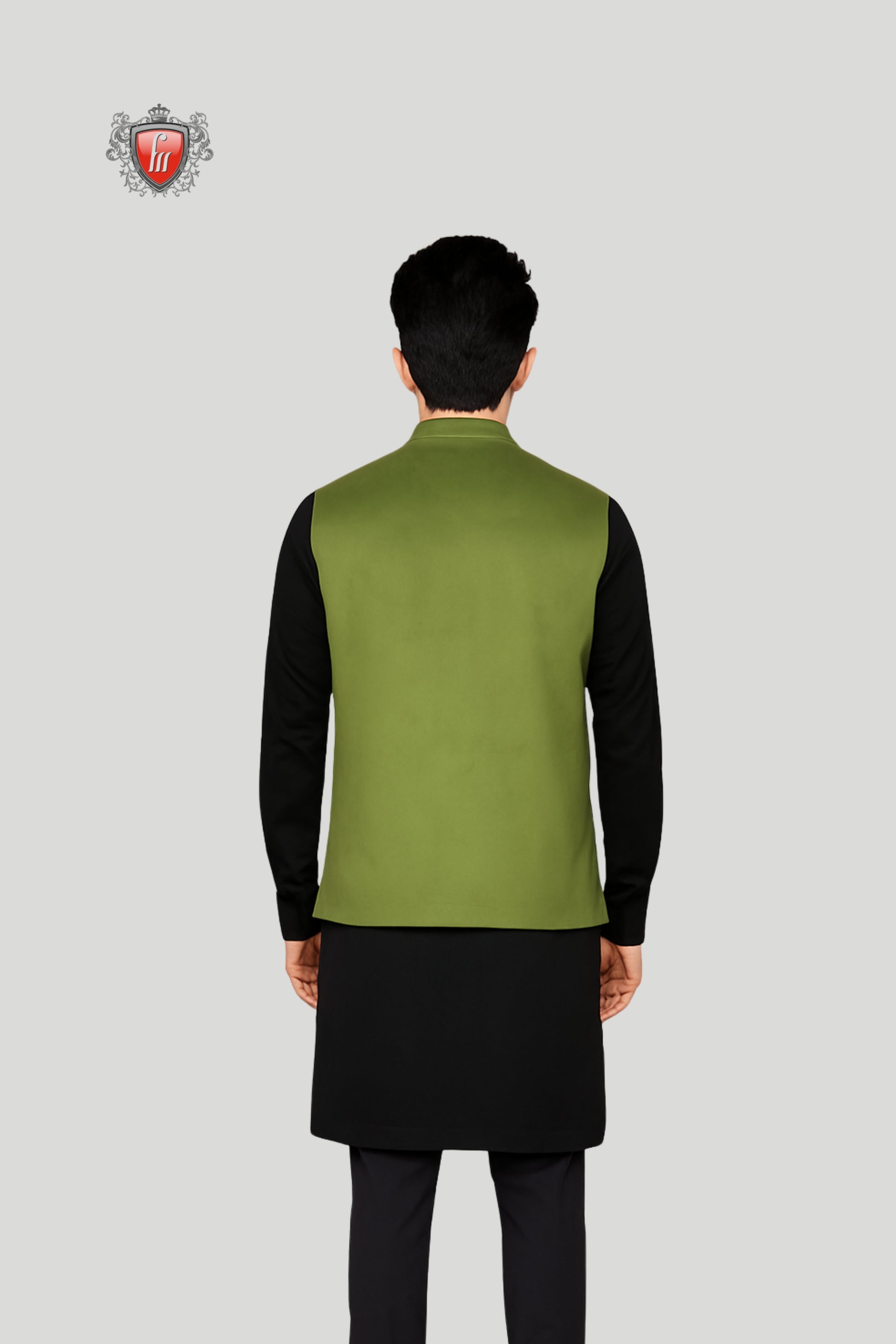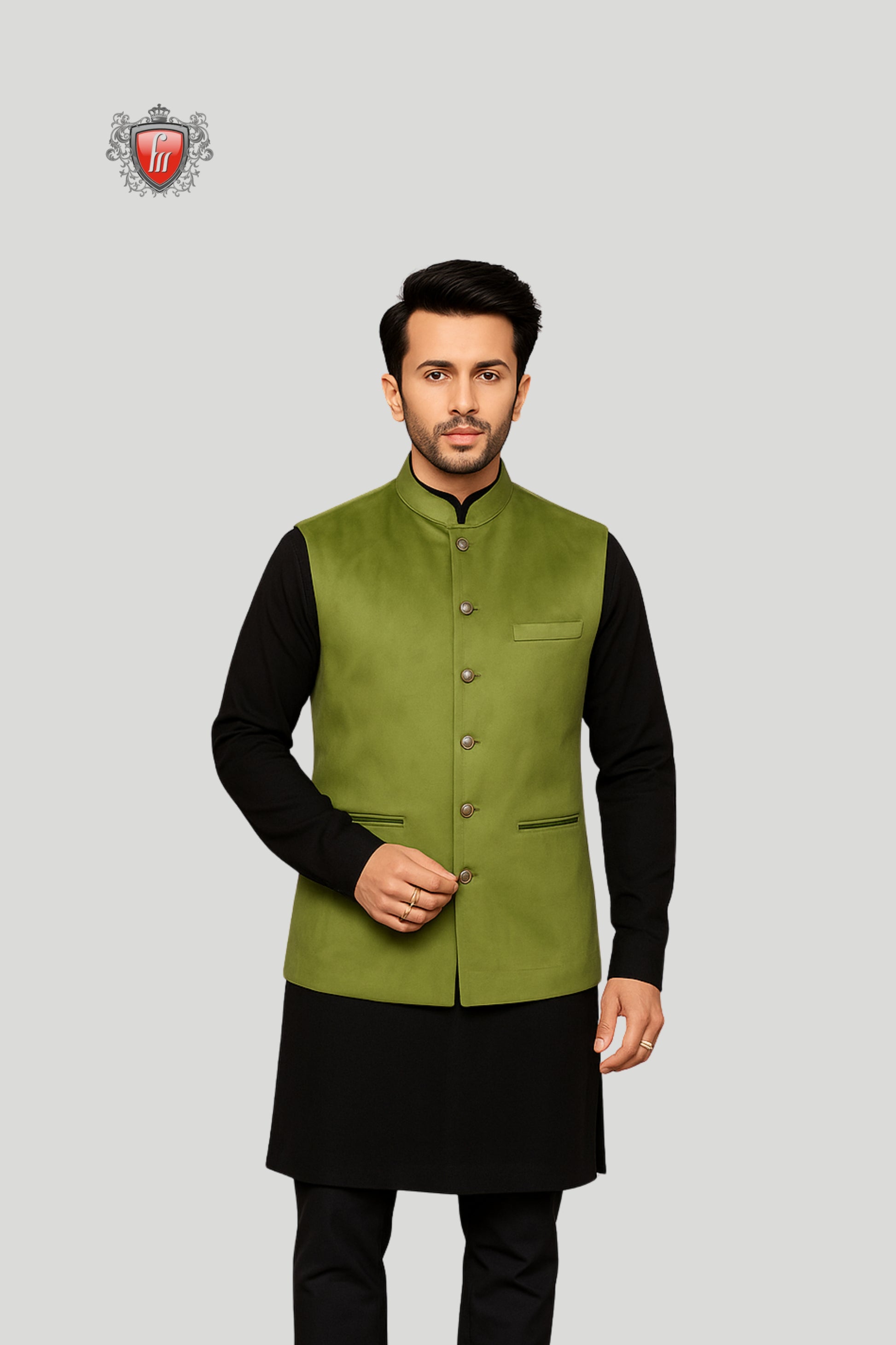 This olive green waistcoat is crafted in a clean solid design, exuding timeless sophistication with a modern edge. Styled with a mandarin collar, metallic buttons, and welt pockets, it is tailored for versatility and refinement. Perfect for weddings, festive occasions, and formal gatherings, this waistcoat adds a bold yet elegant statement to any ethnic ensemble.