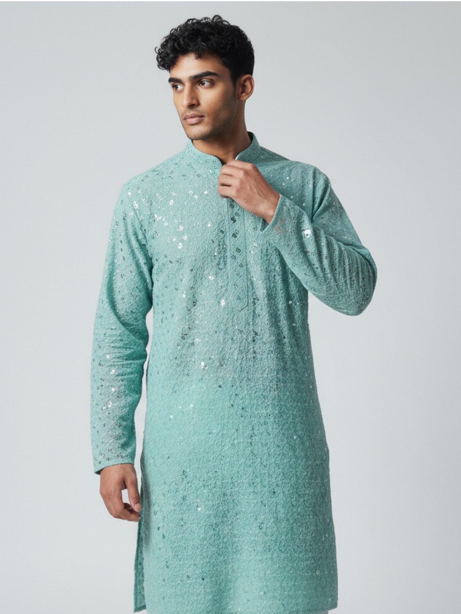 Keywords: aqua blue chikankari kurta pajama, embroidered kurta for men, mirror work kurta Canada, festive kurta pajama set, men’s ethnic wear