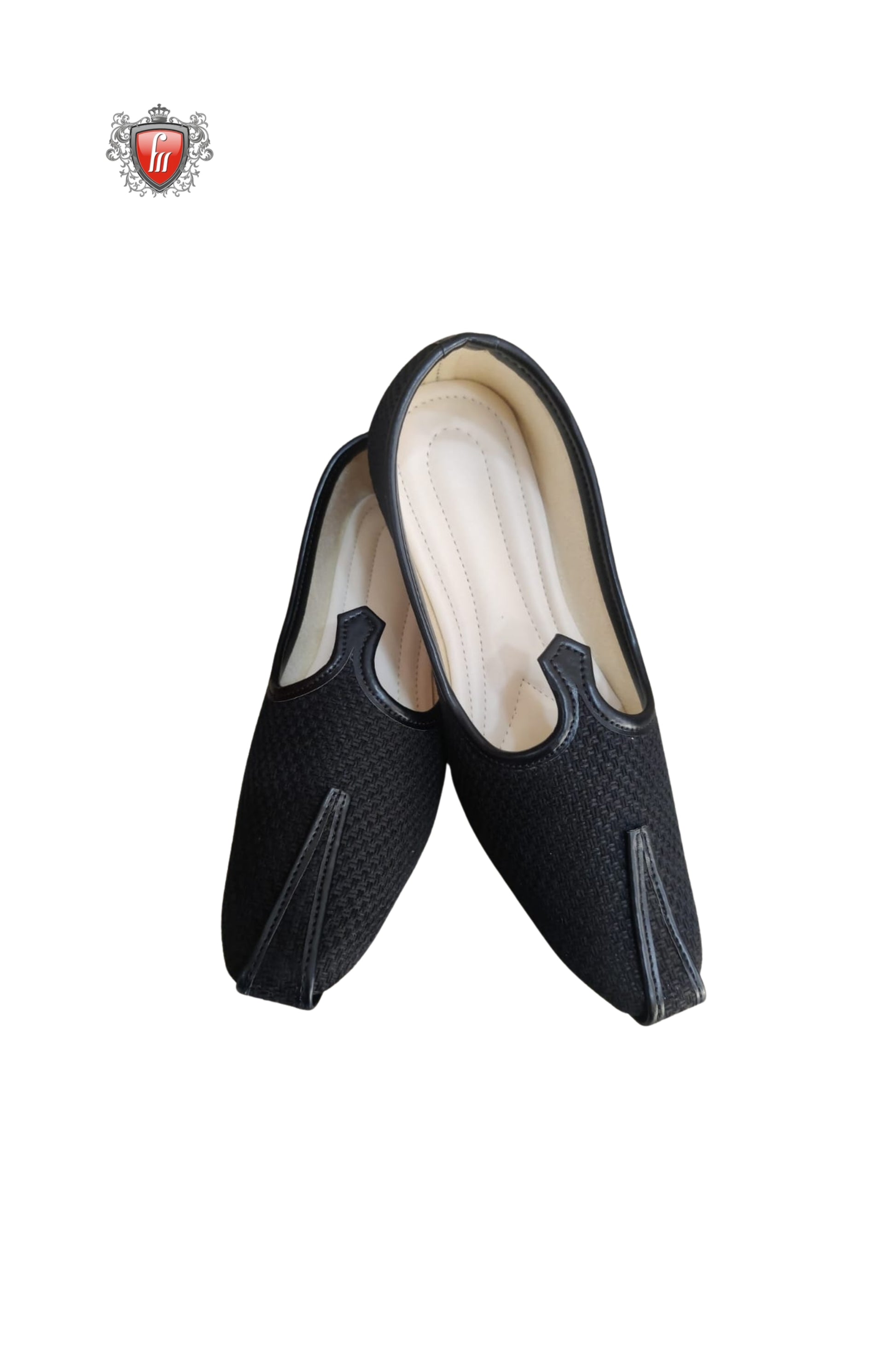 This black textured mojari is a timeless addition to any ethnic wardrobe. Featuring a subtle woven pattern and a sleek pointed toe, it combines traditional craftsmanship with modern minimalism. The cushioned insole ensures comfort, while the versatile design makes it perfect for pairing with sherwanis, kurtas, or Indo-western outfits. Ideal for weddings, receptions, or festive occasions, this mojari adds understated elegance to your look.
