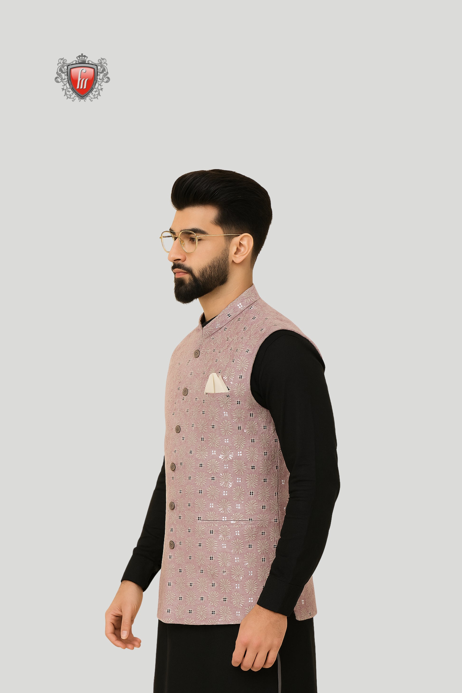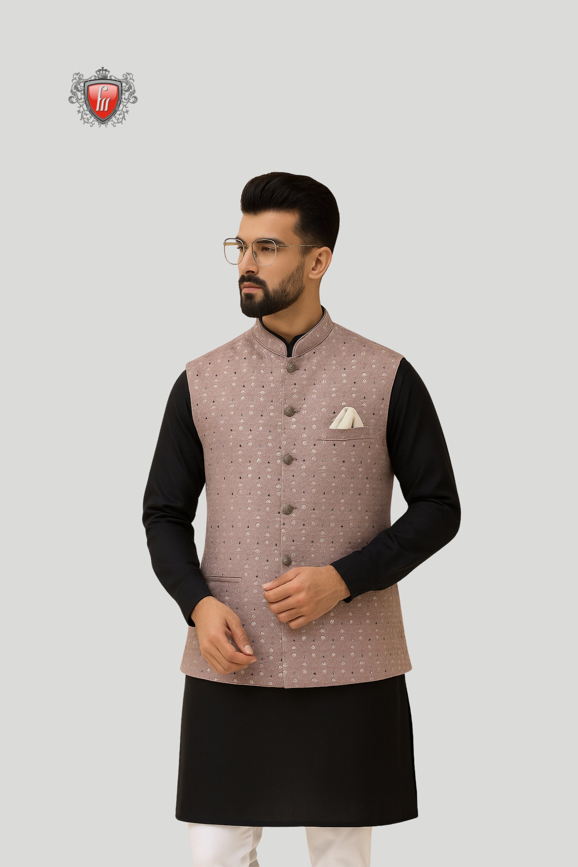 This dusty pink waistcoat features delicate all-over motifs that add a refined charm to its design. Styled with a mandarin collar, matte-finish buttons, and welt pockets, it balances simplicity with sophistication. The addition of a crisp pocket square enhances its polished look, making it a versatile choice for weddings, receptions, festive occasions, and formal gatherings.