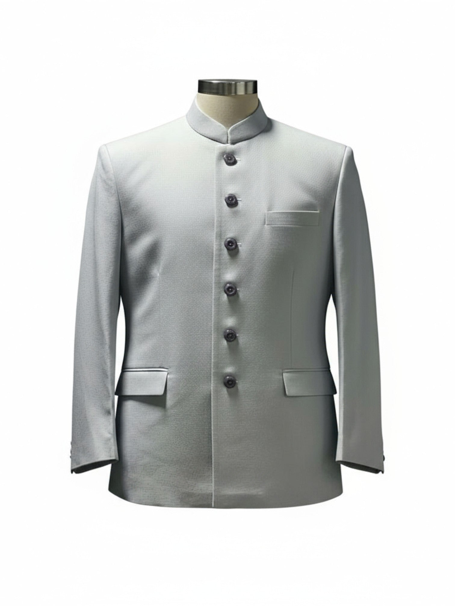 Redefine sophistication with this Light Grey Jodhpuri Suit, a perfect expression of modern minimalism and timeless class. Tailored from fine suiting fabric, it features a sleek mandarin collar, structured shoulders, and bold black buttons that create a clean, confident silhouette. The subtle woven texture and matching trousers enhance its premium finish, making it ideal for both formal and festive occasions.