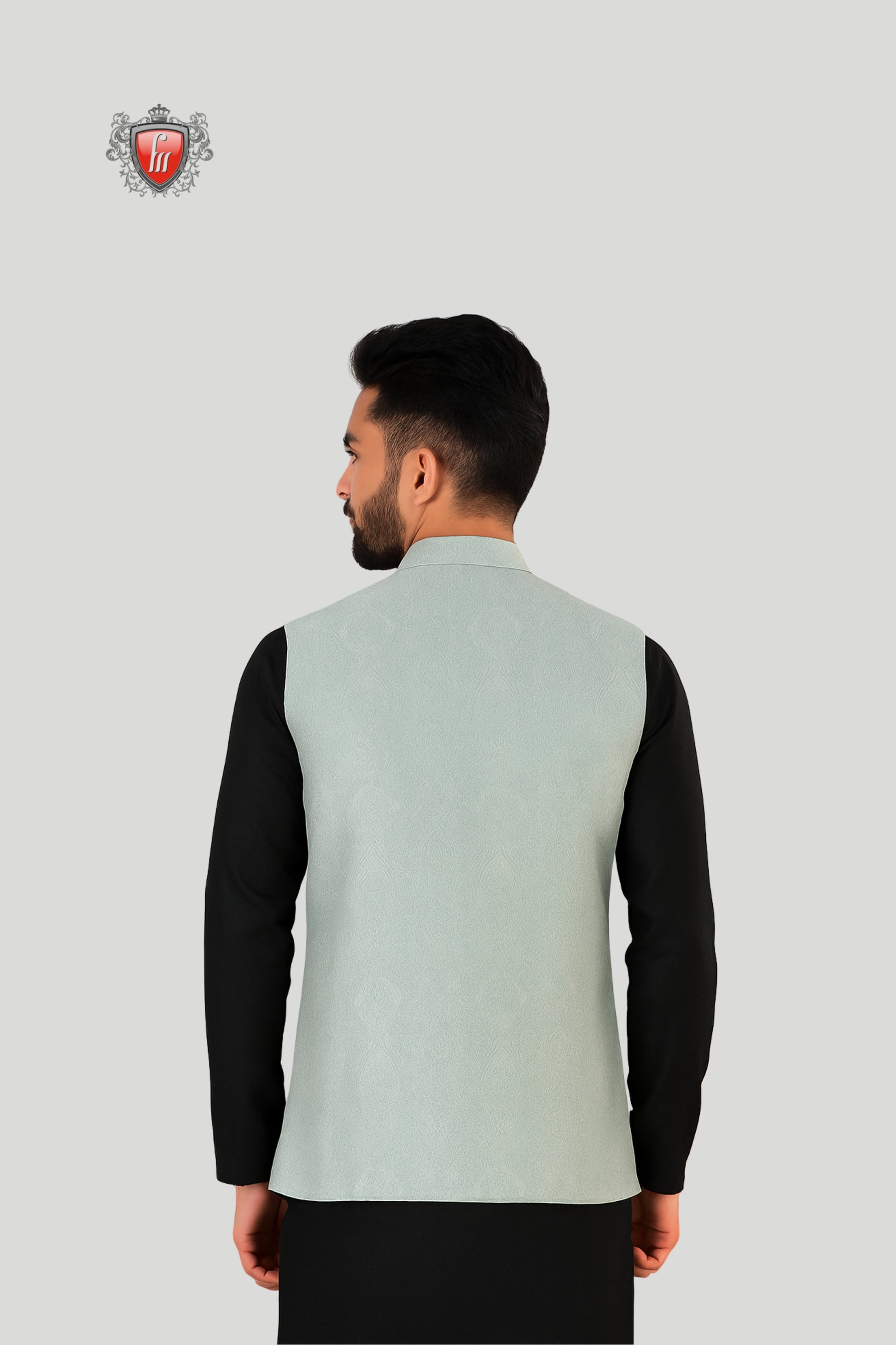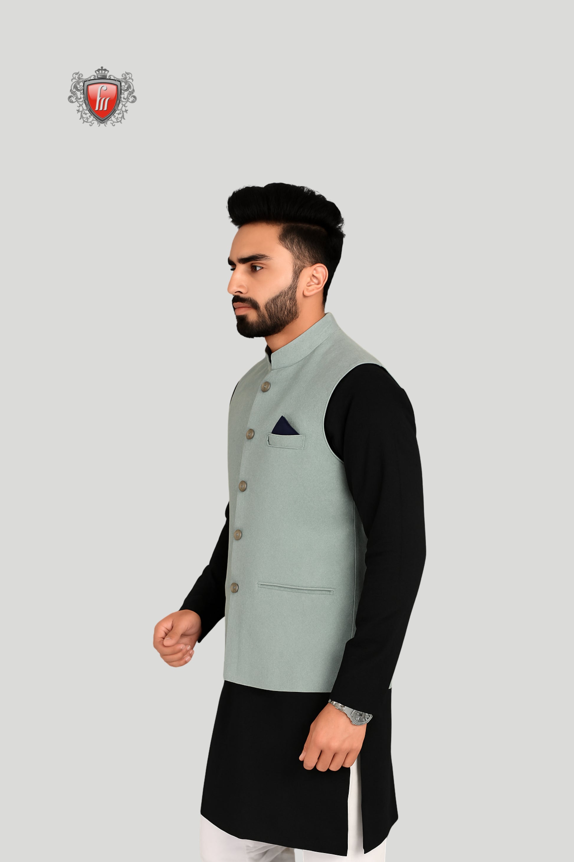 This light grey waistcoat is tailored with a sleek, minimal design that exudes refined sophistication. Featuring a mandarin collar, matte-finish buttons, and welt pockets with a navy pocket square accent, it blends traditional charm with contemporary style. A versatile layering piece, perfect for weddings, festive occasions, and formal gatherings where understated elegance makes the strongest statement.