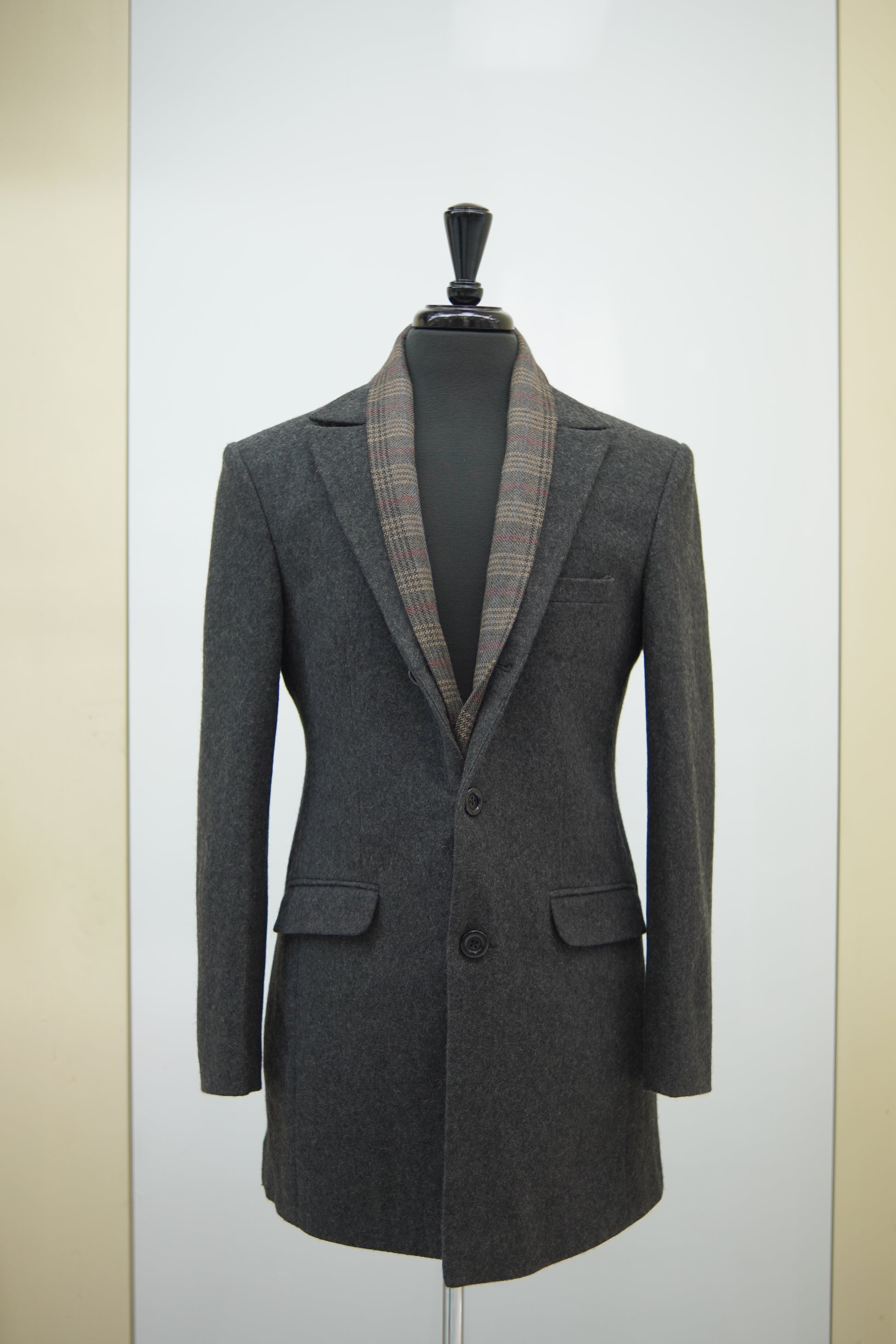 Men’s Dark Grey Wool Overcoat with Plaid Inner Lapel – Tailored Modern Winter Coat