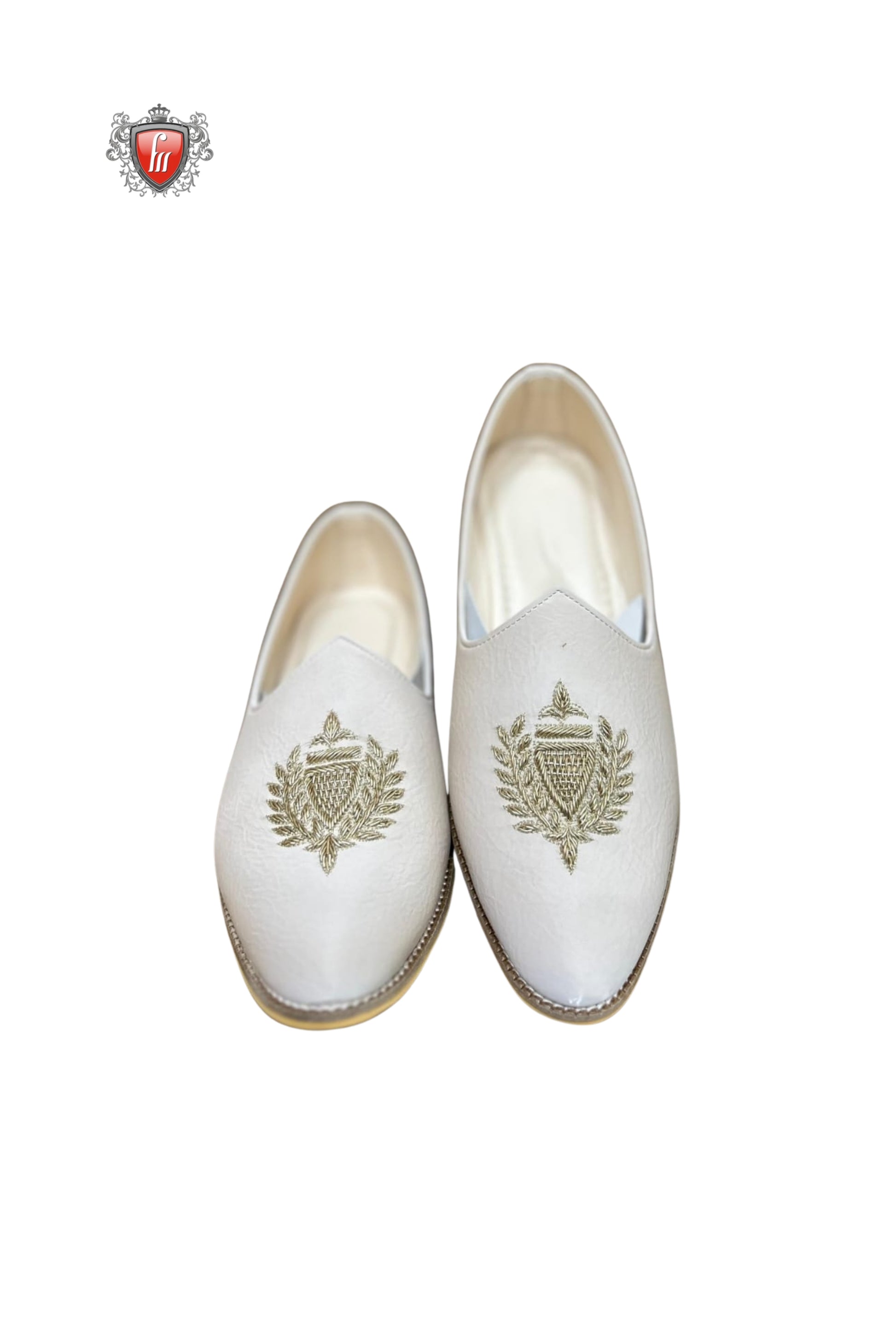Step into timeless elegance with this white jutti adorned with a golden crest embroidery. The royal-inspired motif exudes class and sophistication, making it the perfect match for sherwanis, bandhgalas, and Indo-western ensembles. Designed with a comfortable inner lining and durable sole, this jutti blends style with practicality—ideal for weddings, festive gatherings, and grand occasions.
