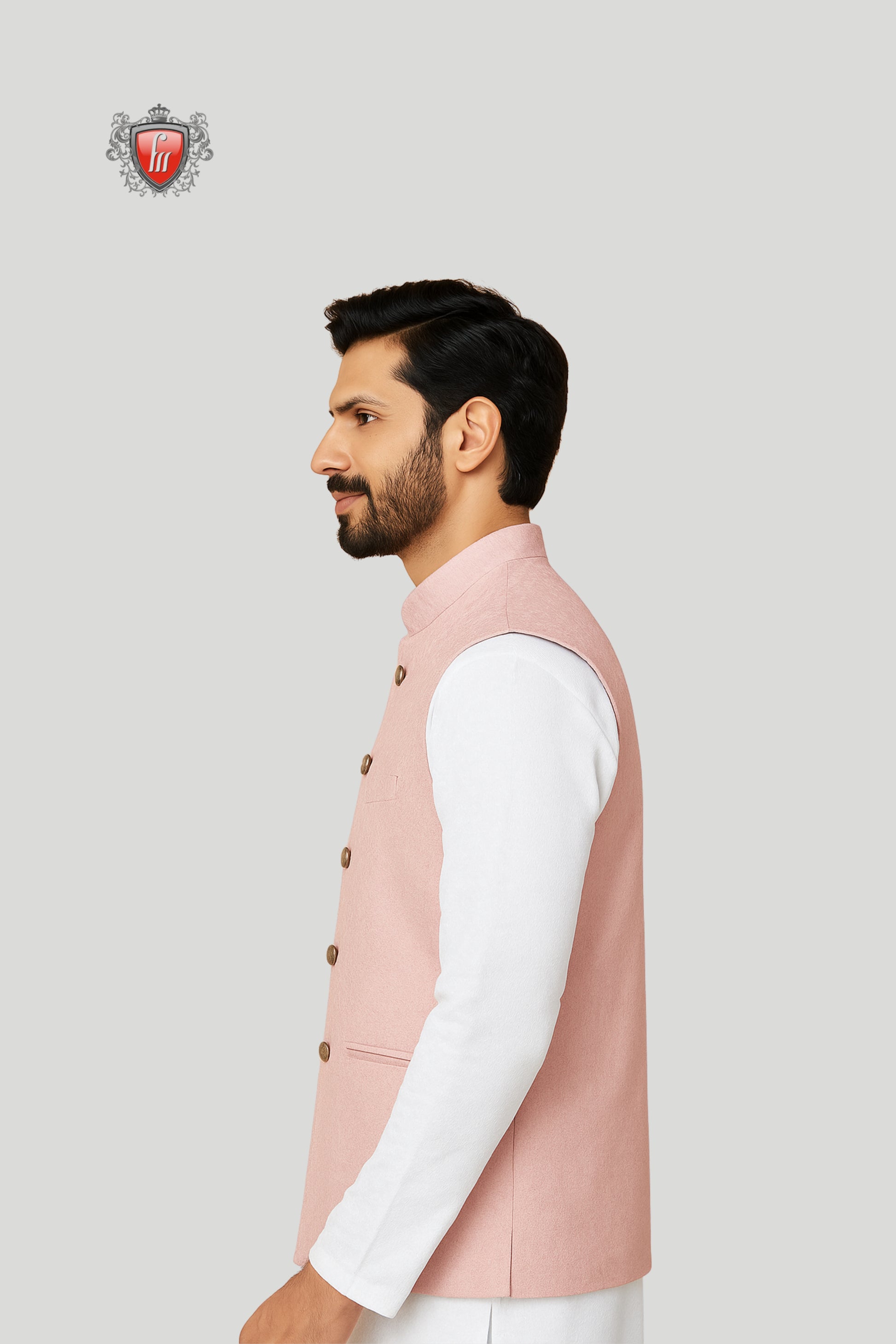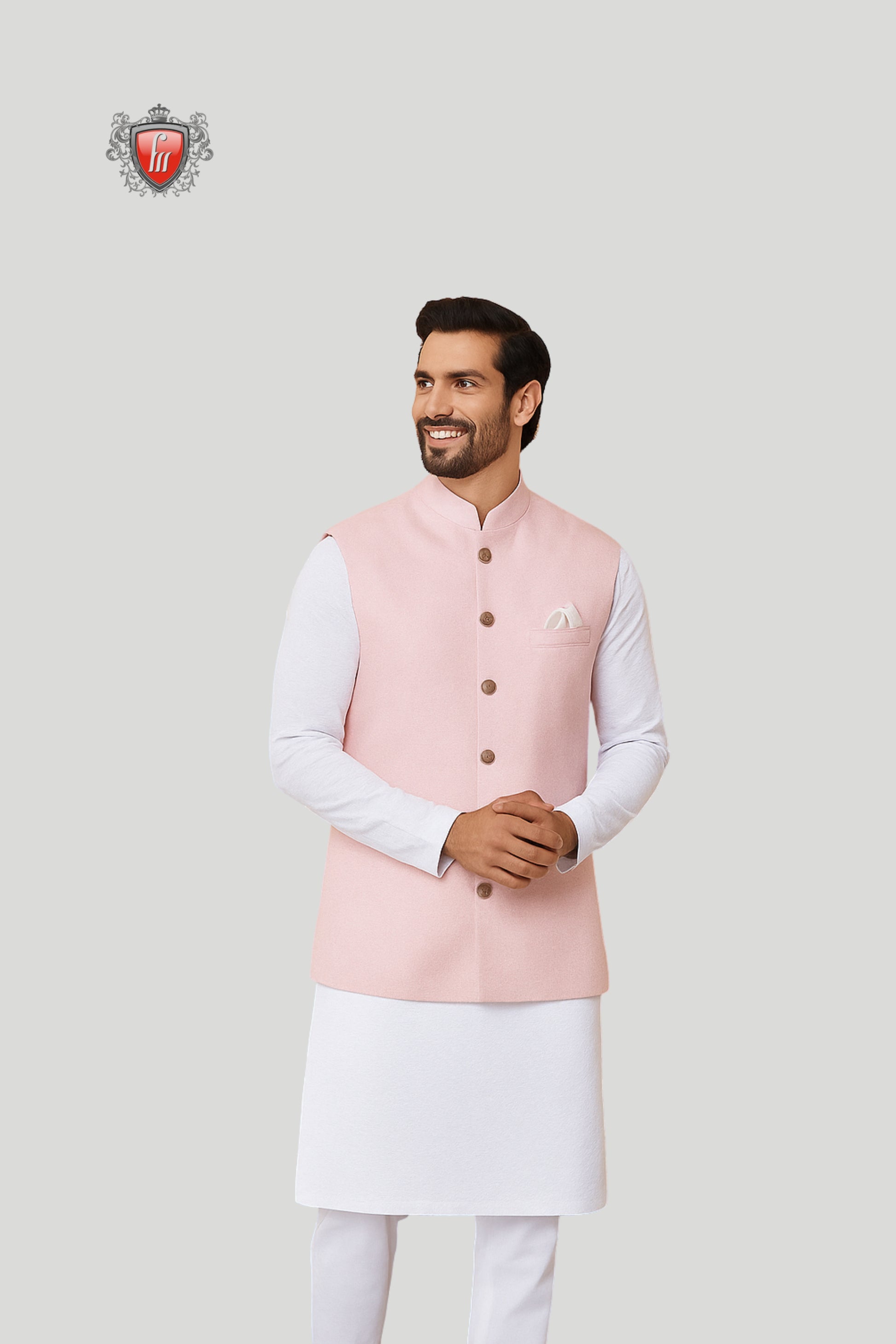 This pastel pink waistcoat brings a soft yet refined charm to traditional attire. Designed with a mandarin collar, classic wooden-style buttons, and a neatly folded pocket square, it strikes the perfect balance between simplicity and sophistication. Ideal for weddings, festive gatherings, and cultural occasions, this versatile waistcoat adds a modern touch to timeless ethnic wear.