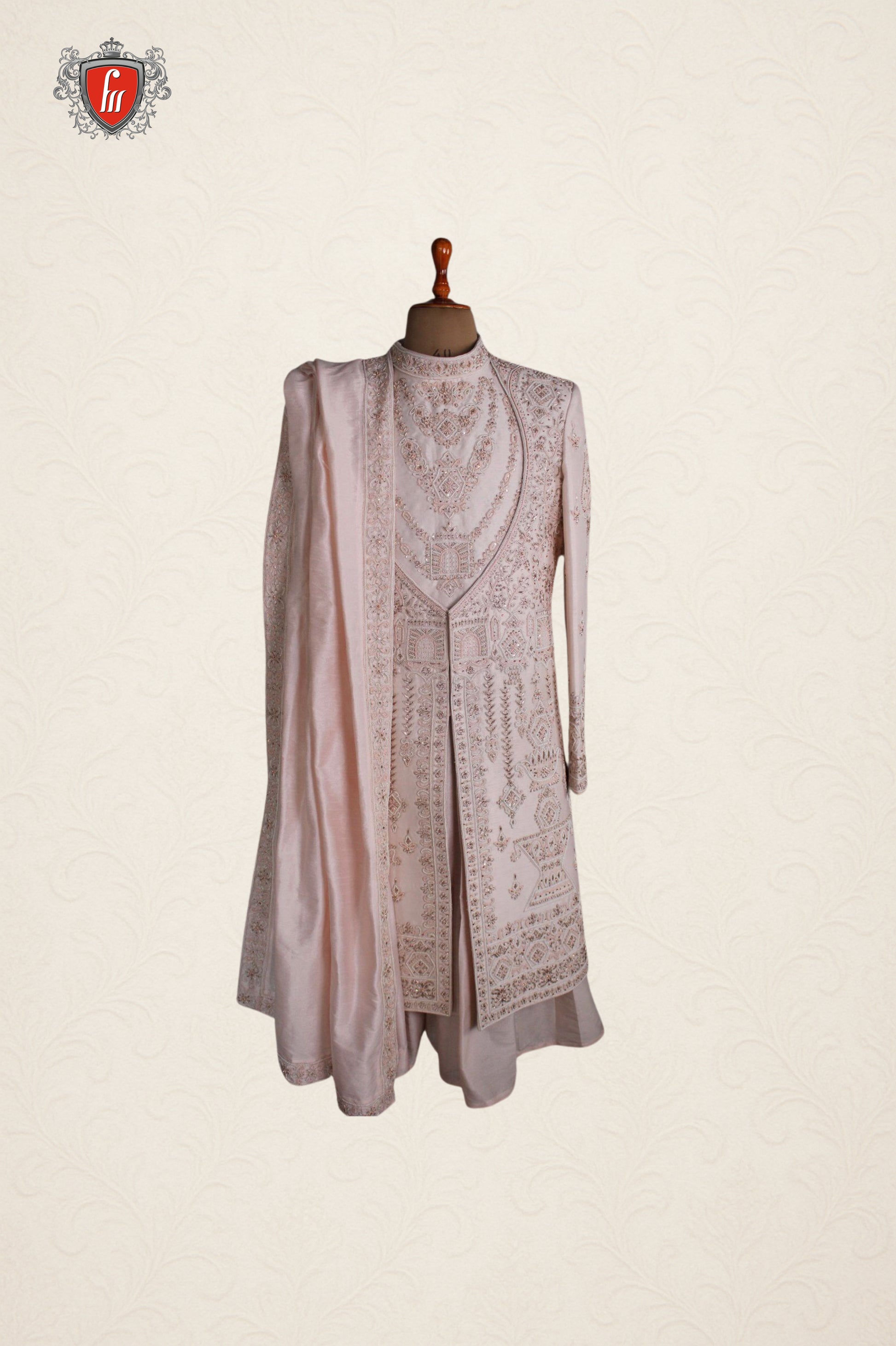 Elevate your celebration look with the Regal Blush Embroidered Sherwani — a perfect blend of royal elegance and modern charm. Set in a soft blush tone, this sherwani is adorned with intricate embroidery that showcases timeless craftsmanship and delicate detailing, creating a rich yet understated aesthetic.