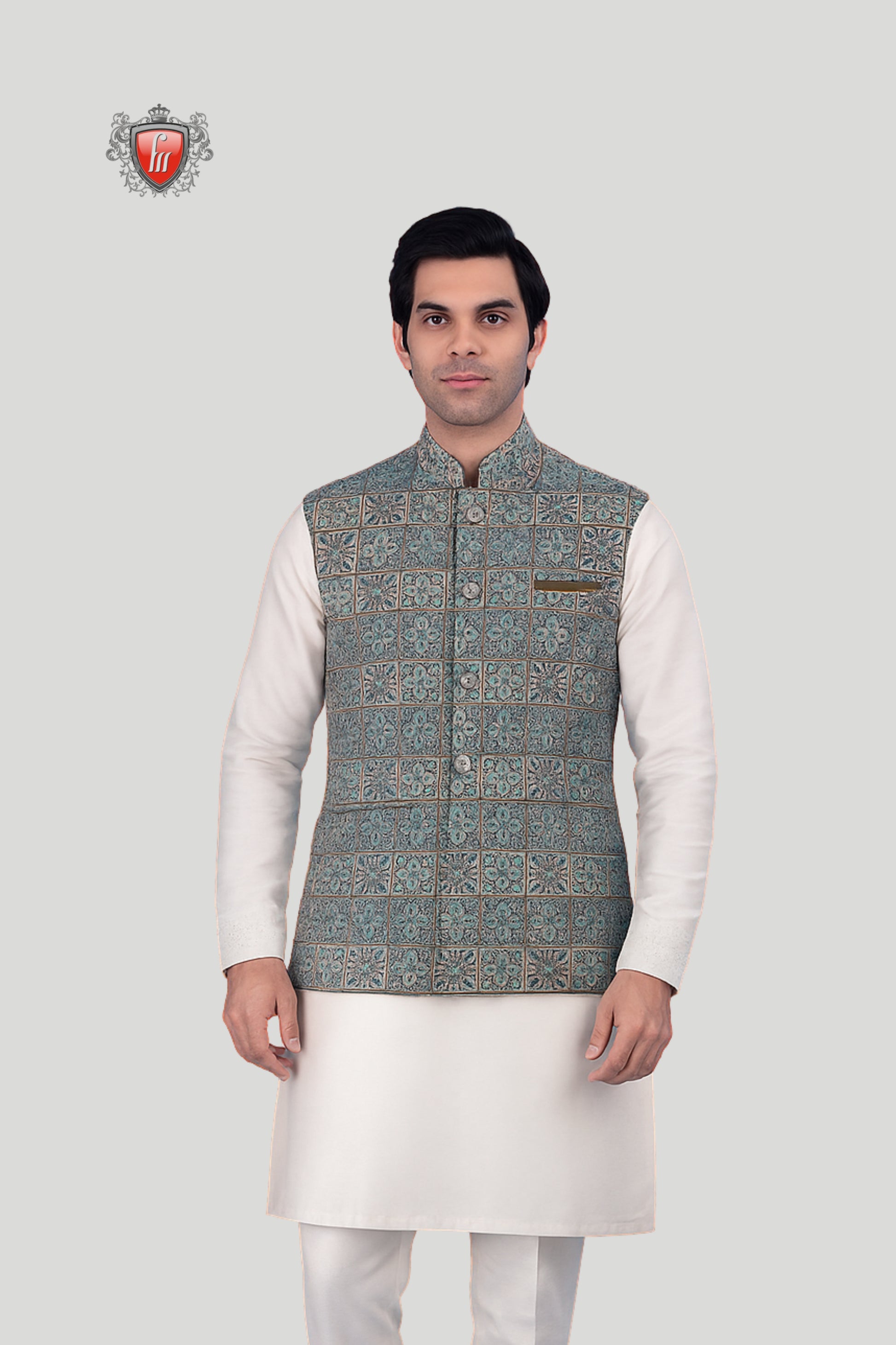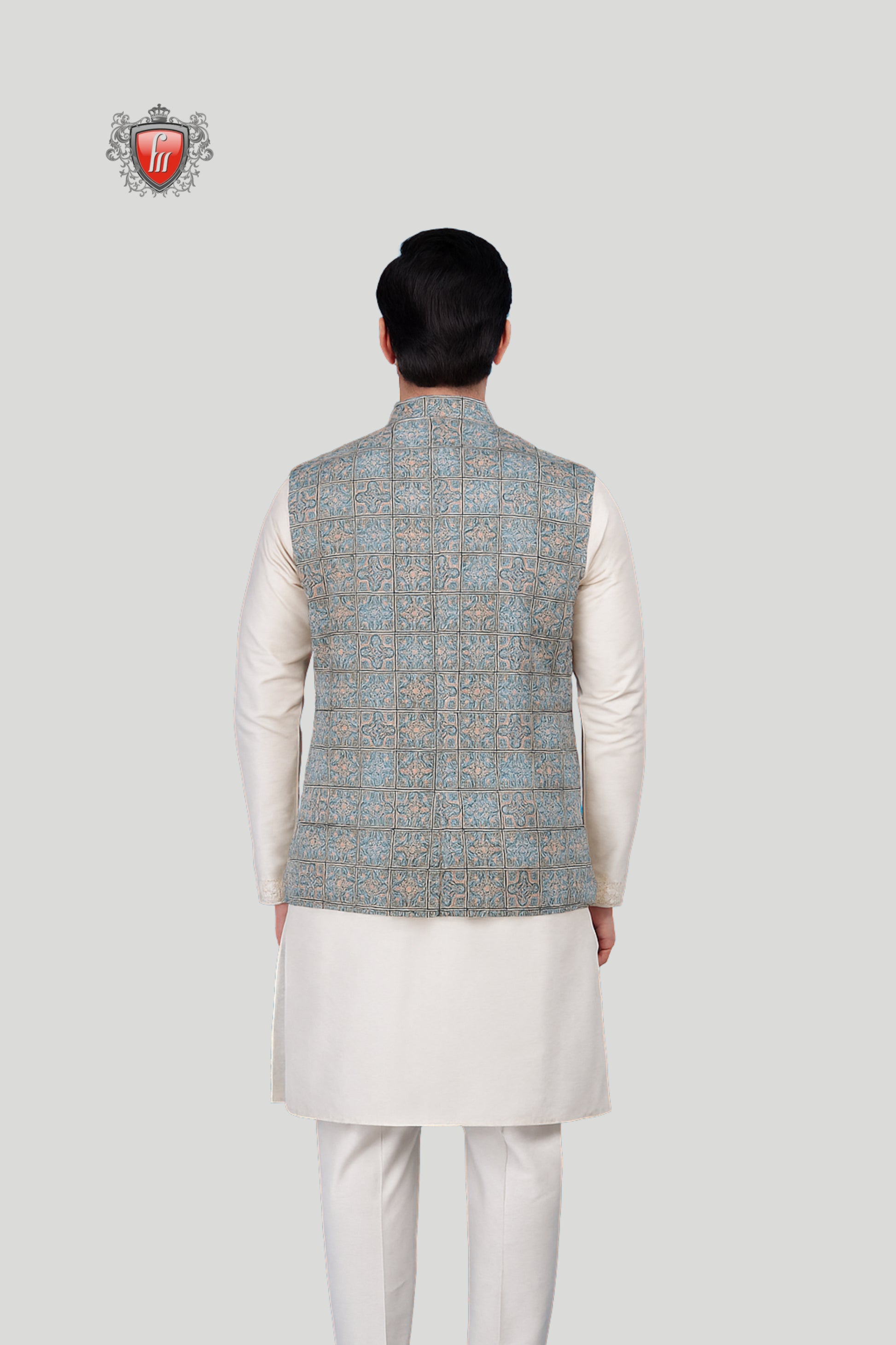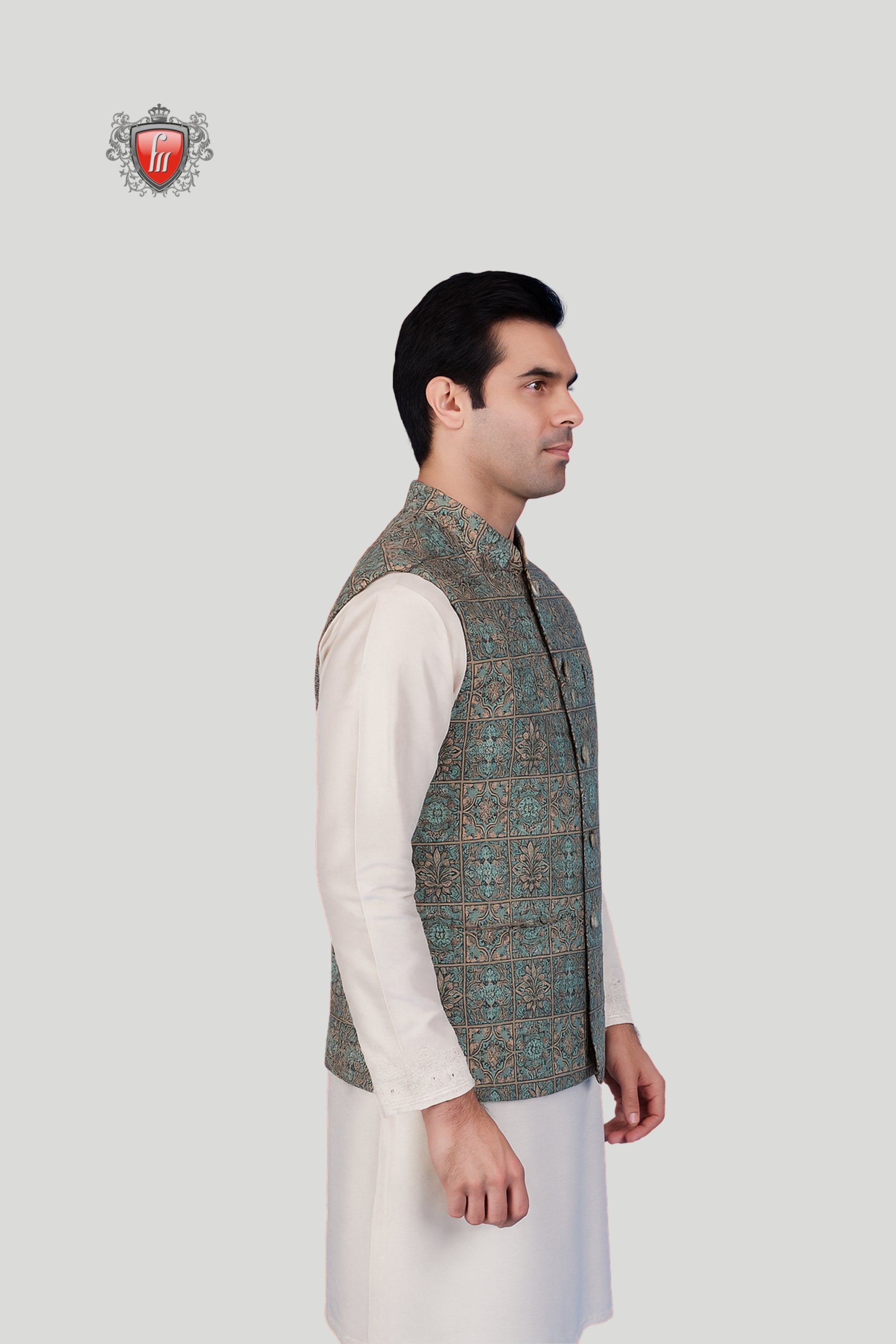 This teal blue waistcoat is adorned with intricate geometric and floral motifs arranged in a block-style print, giving it a regal and sophisticated appeal. Designed with a mandarin collar, metallic buttons, and welt pockets, it blends traditional artistry with modern tailoring. Perfect for weddings, festive gatherings, and cultural occasions, this waistcoat adds a touch of richness and elegance to any ethnic ensemble.