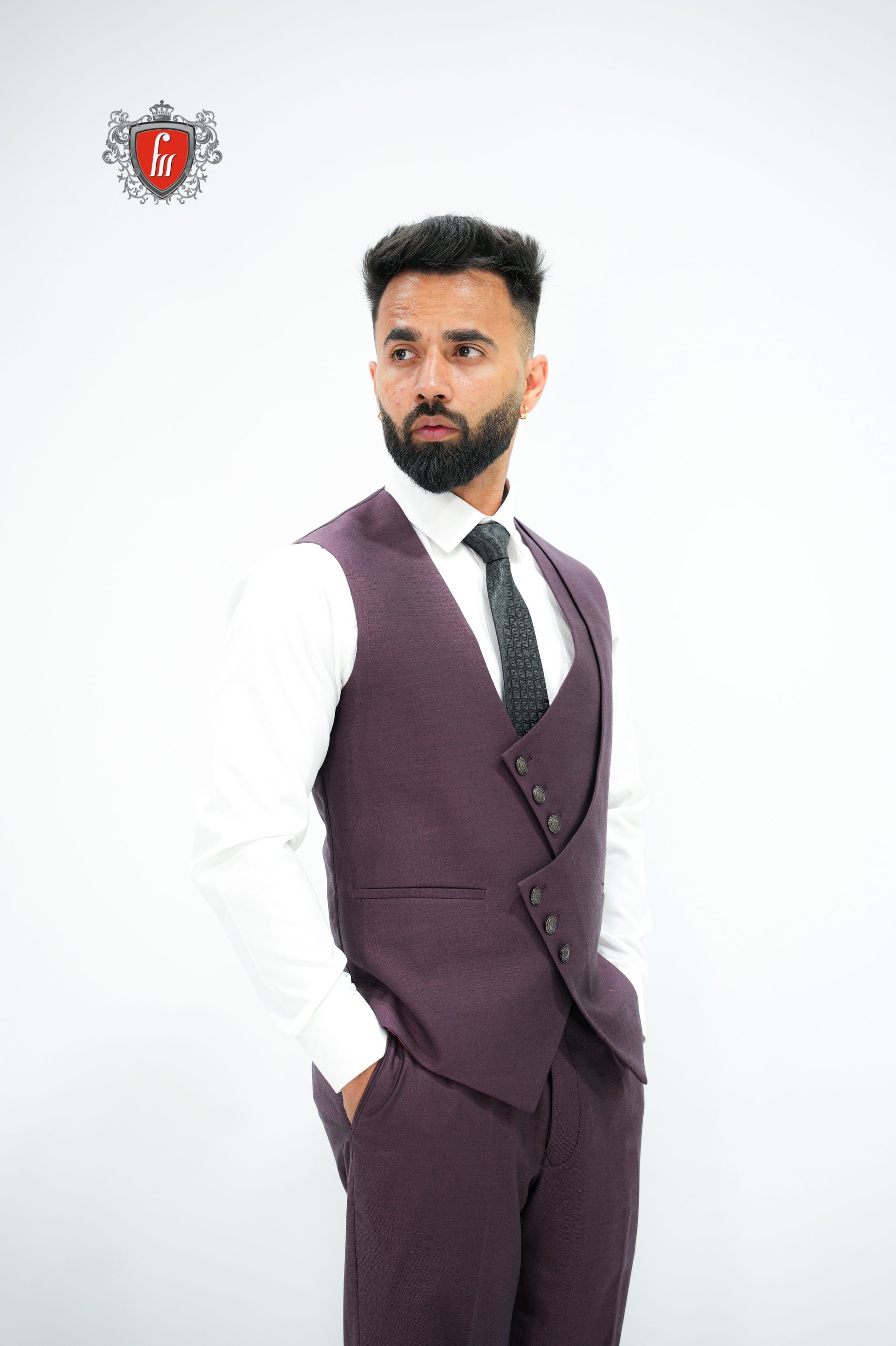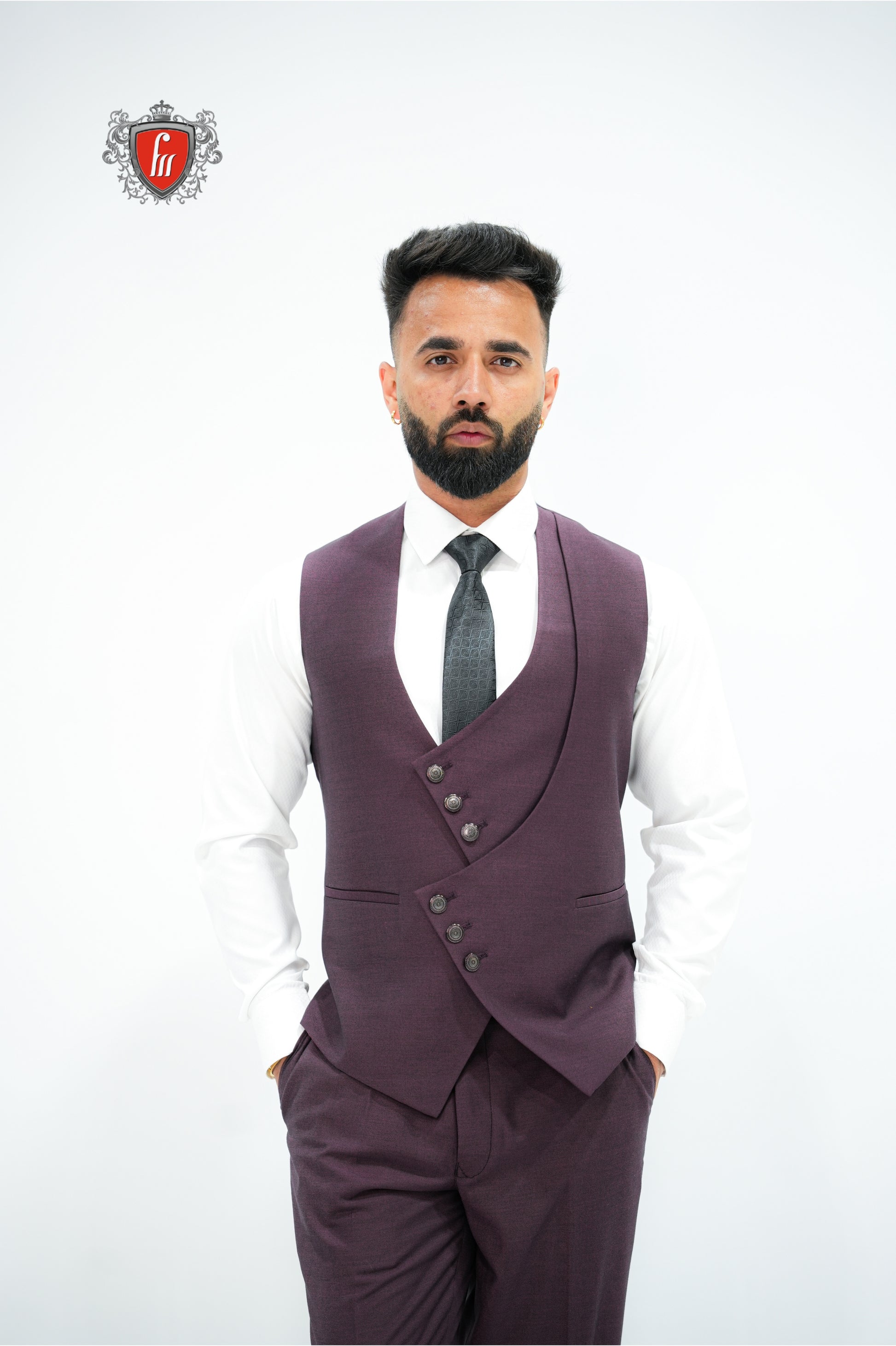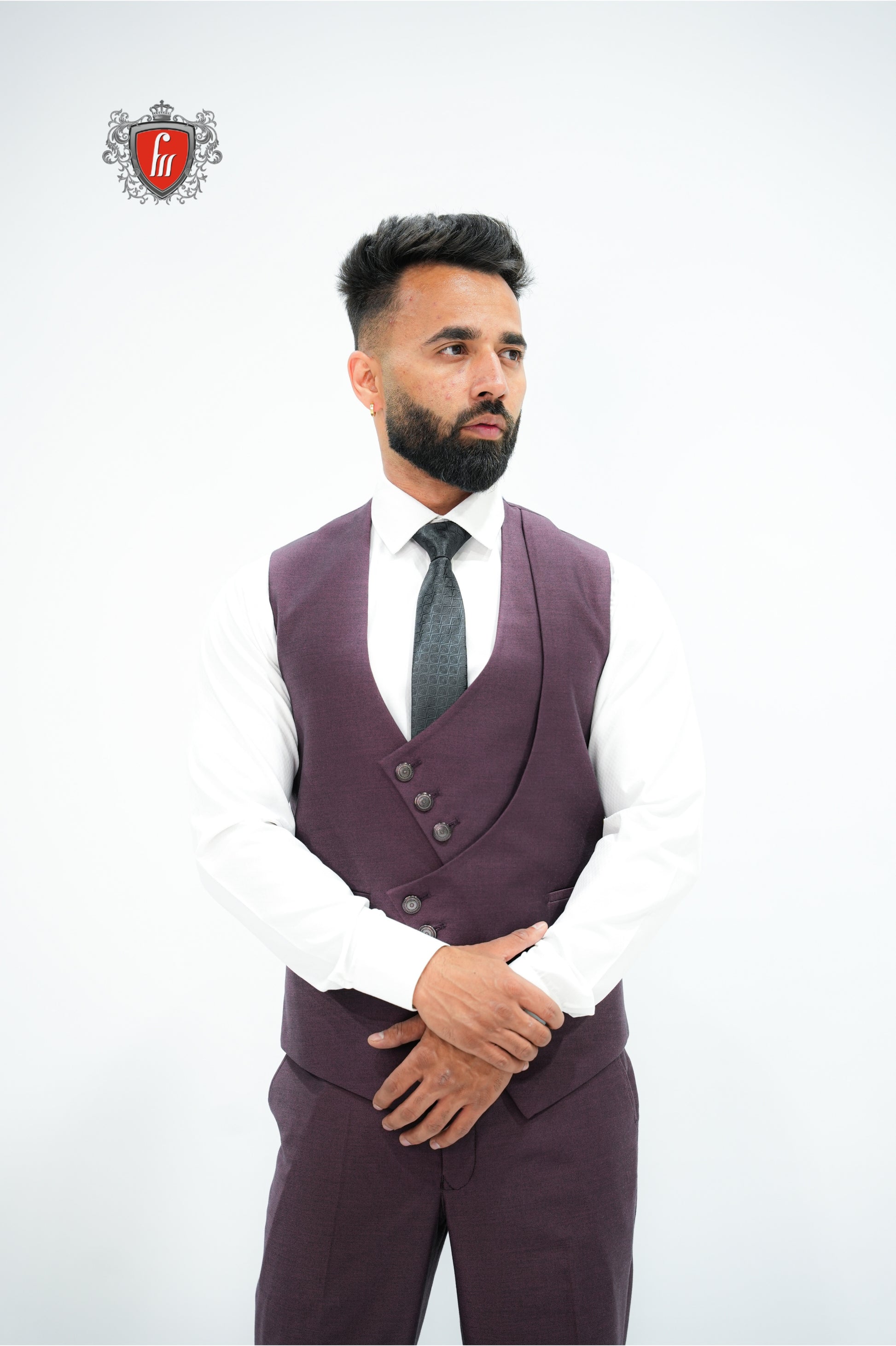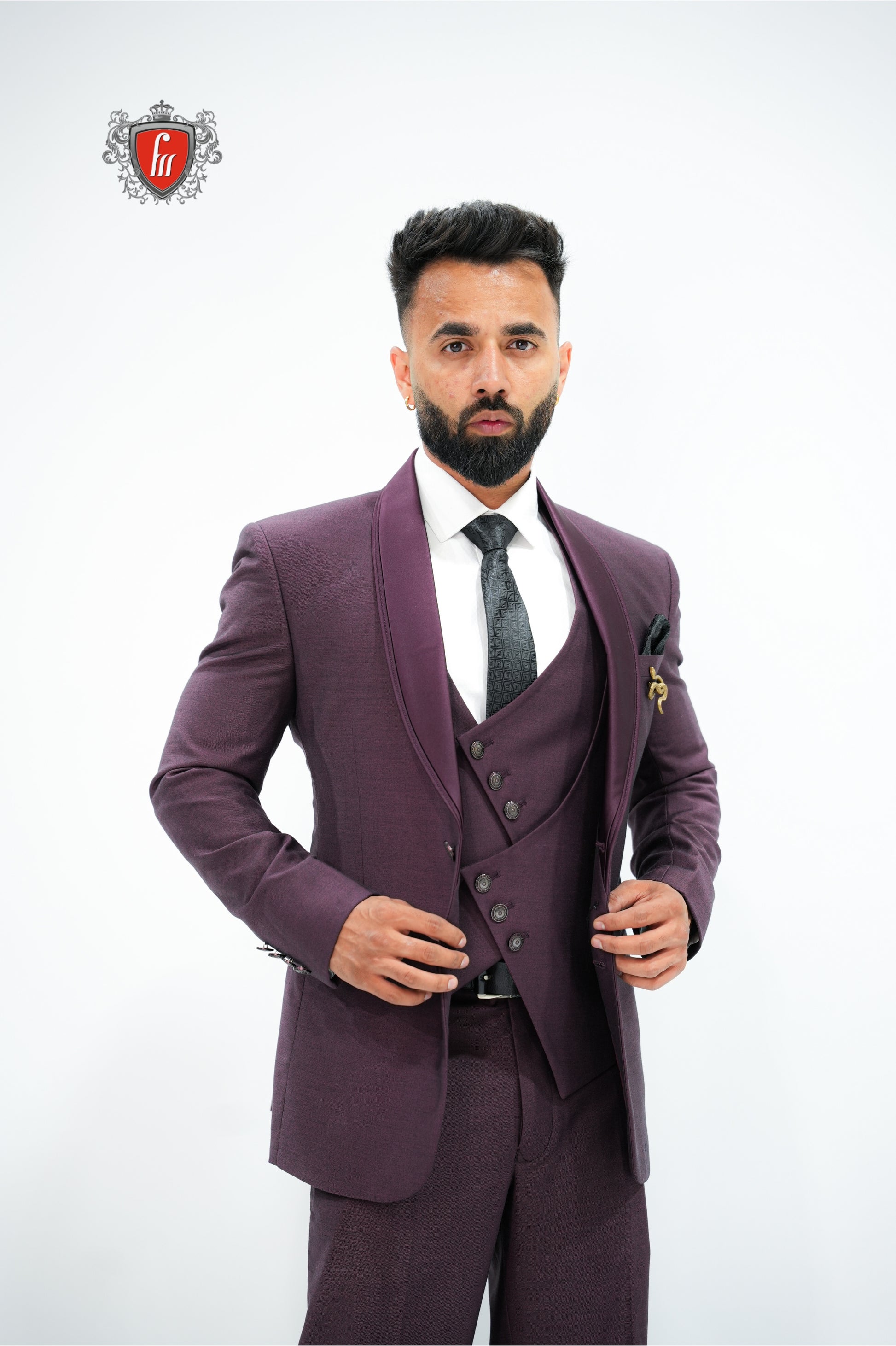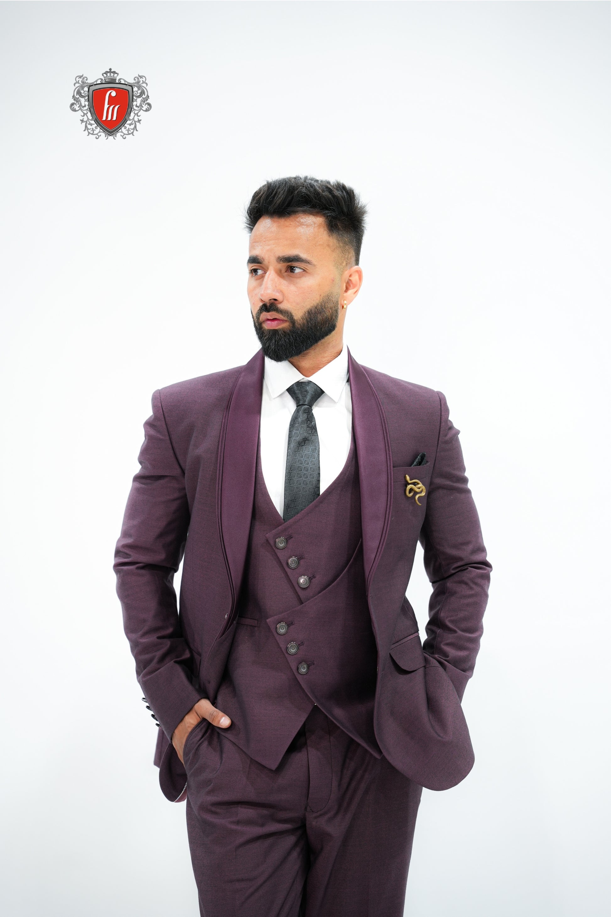 Tailored for elegance, this 3-piece suit in wine maroon pairs a neat shawl collar with a coordinated waistcoat. The ensemble is completed with a brooch and pocket square, making it the ultimate outfit for receptions, formal dinners, and cultural celebrations. More than just attire, this ensemble represents confidence, class, and modern sophistication. It’s crafted for the gentleman who wants to leave a lasting impression without compromising on comfort.