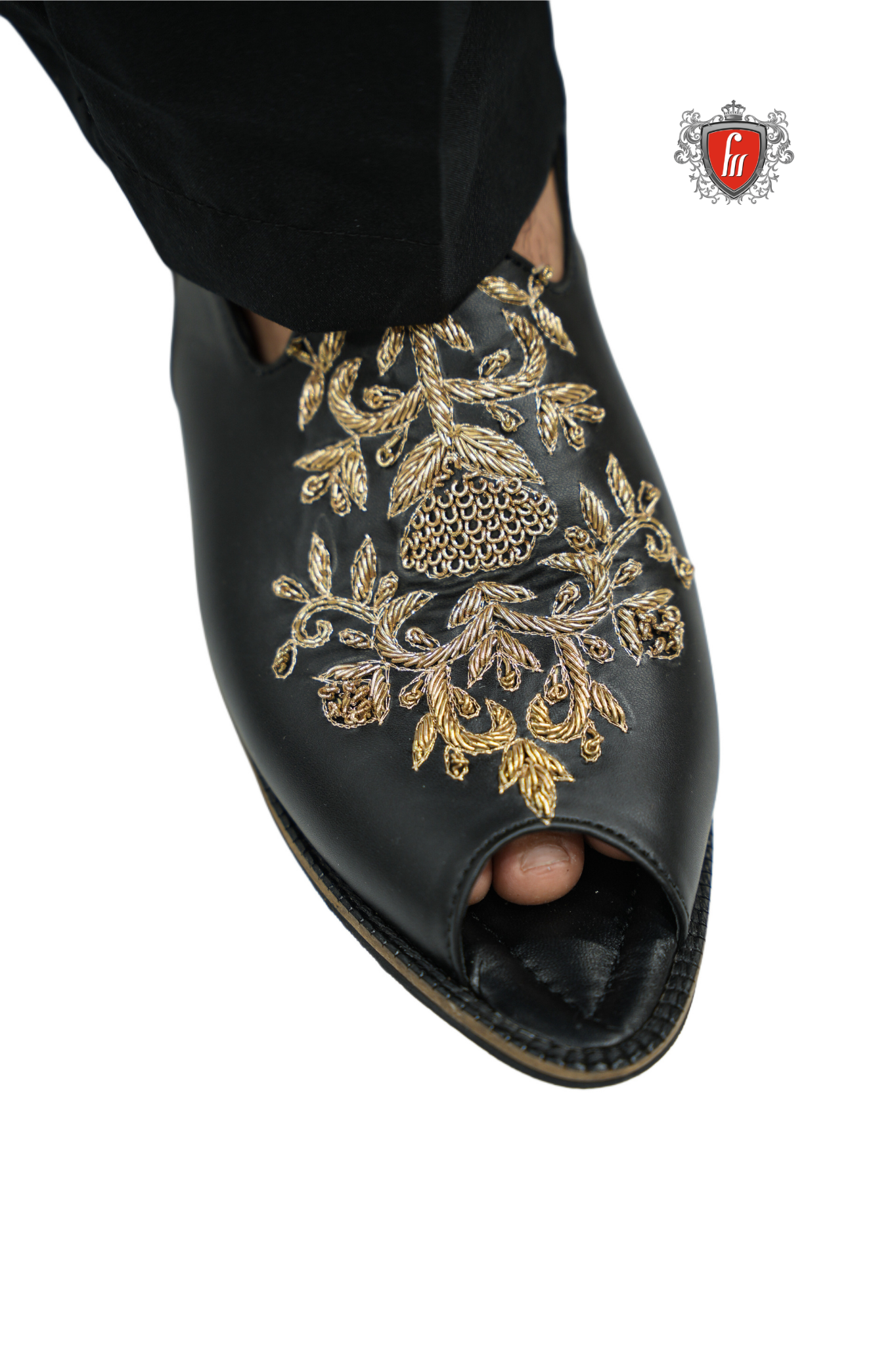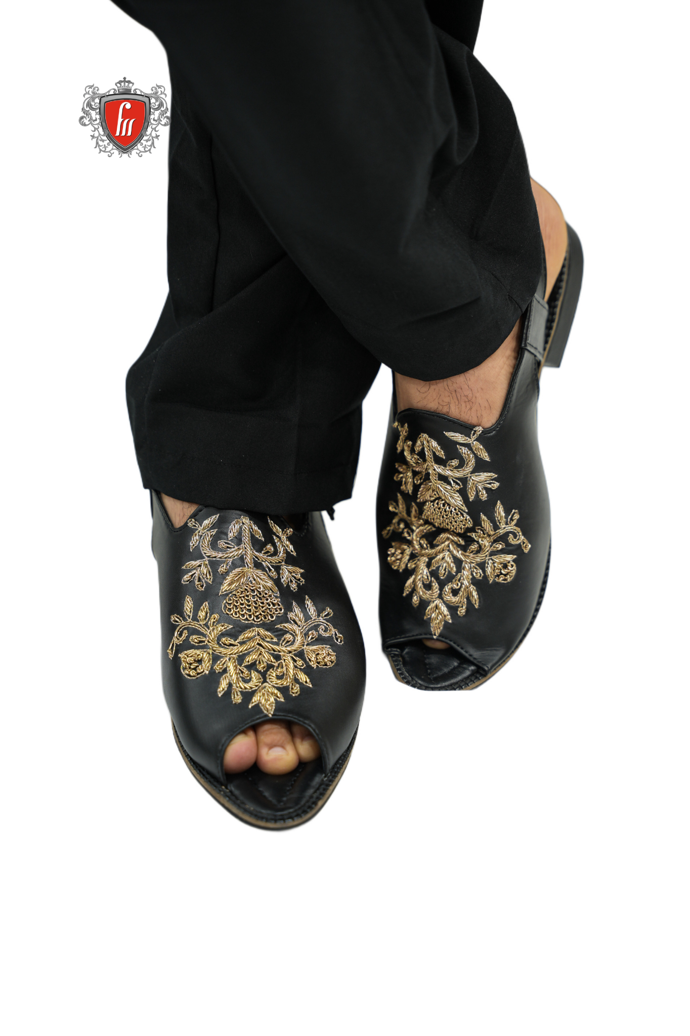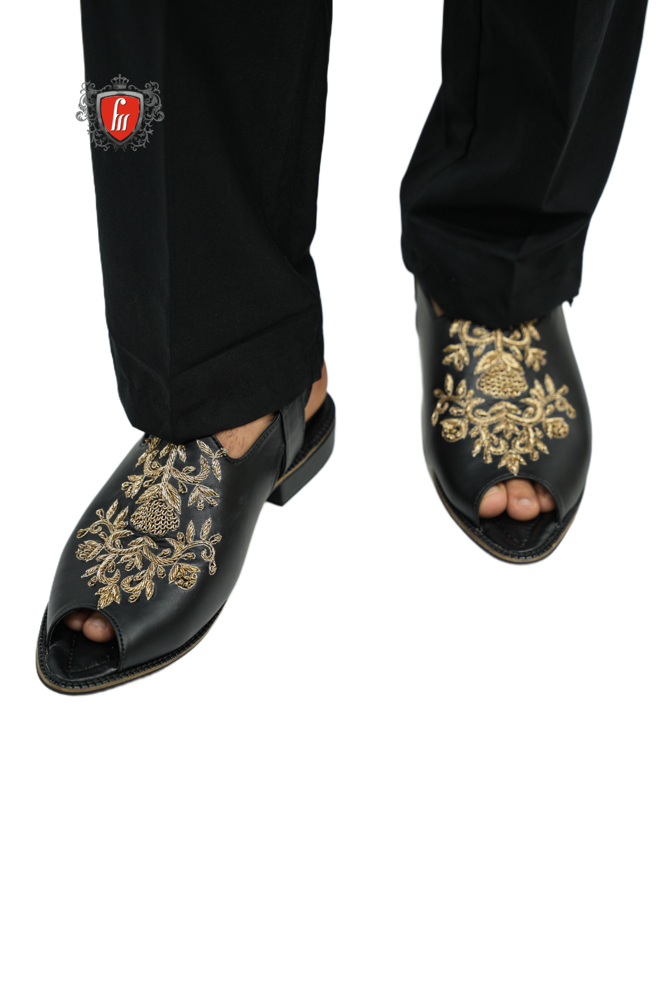 Step into tradition with these black embroidered Peshawari sandals, a perfect fusion of cultural heritage and contemporary elegance. Featuring intricate golden threadwork on premium faux leather, these sandals offer unmatched craftsmanship and comfort. The peep-toe design and secure backstrap make them ideal for festive wear while adding flair to your ethnic ensemble.