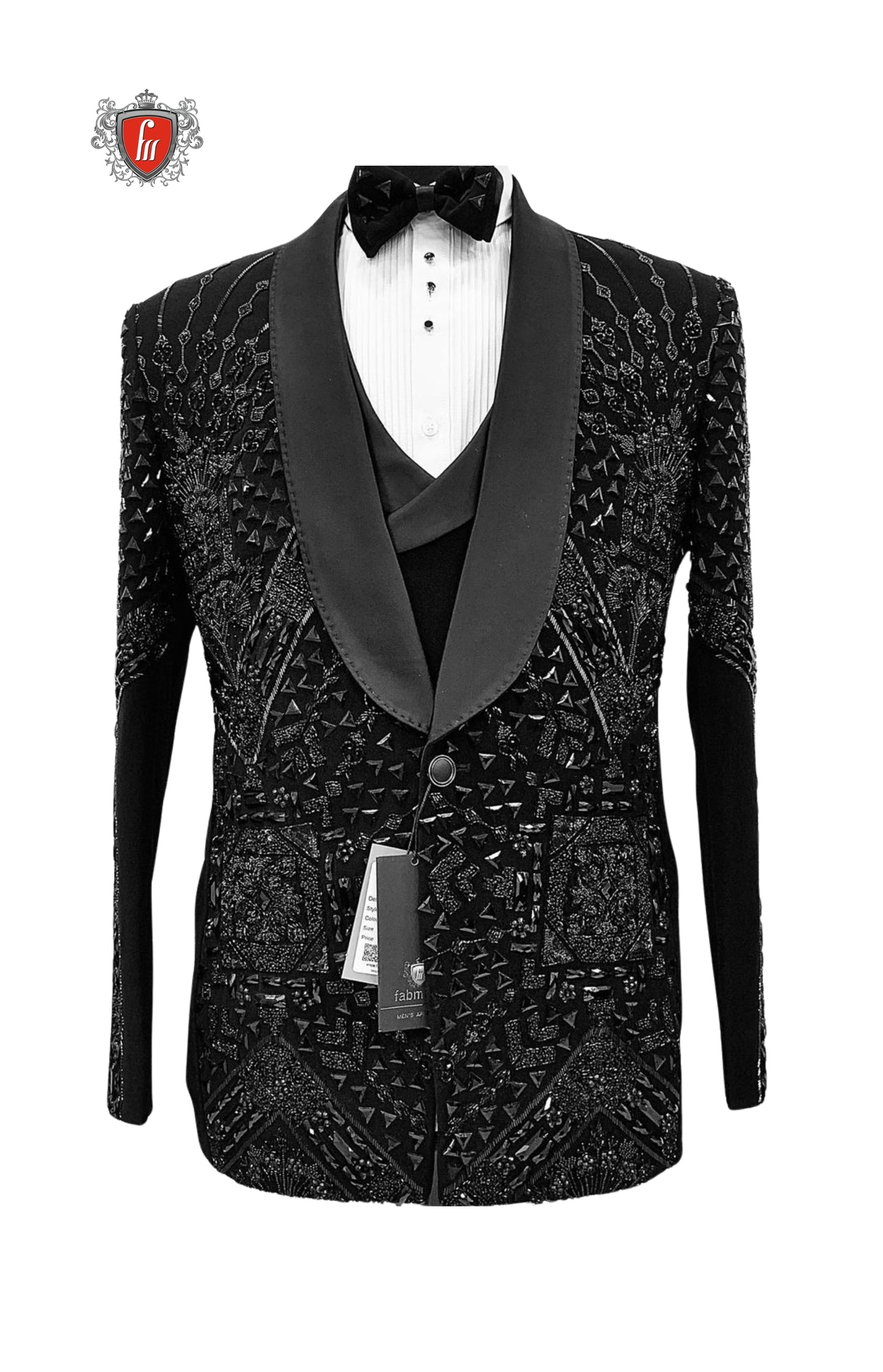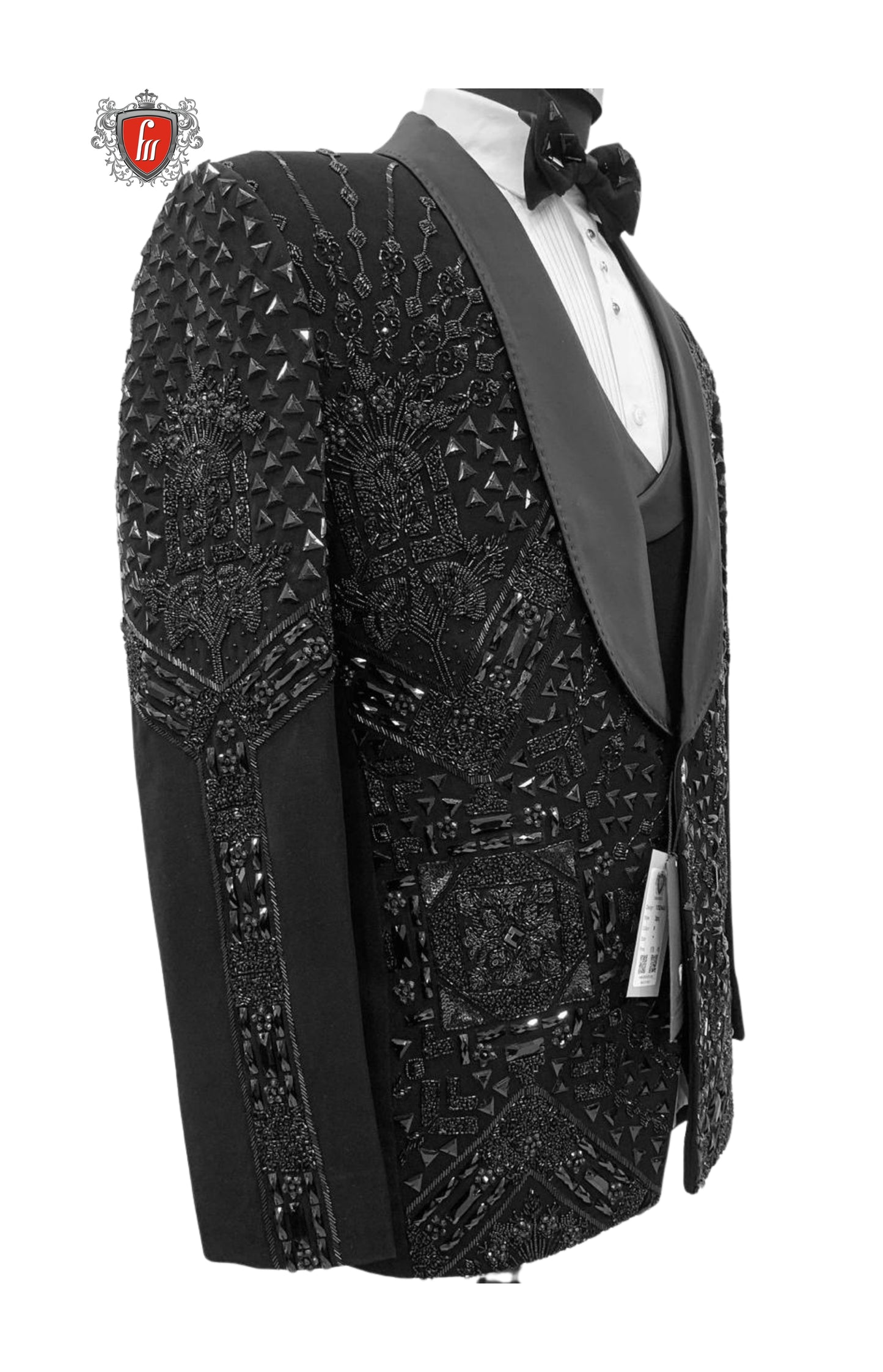 Make an unforgettable entrance in this masterpiece tuxedo, designed for the modern gentleman with a taste for bold luxury. Featuring an intricate arrangement of black crystals, geometric beadwork, and shimmering embellishments, this jacket reflects artistry in every detail. The smooth satin shawl lapel adds a sleek contrast, while the layered vest and pleated shirt elevate the entire ensemble to black-tie perfection. Ideal for weddings, high-fashion events