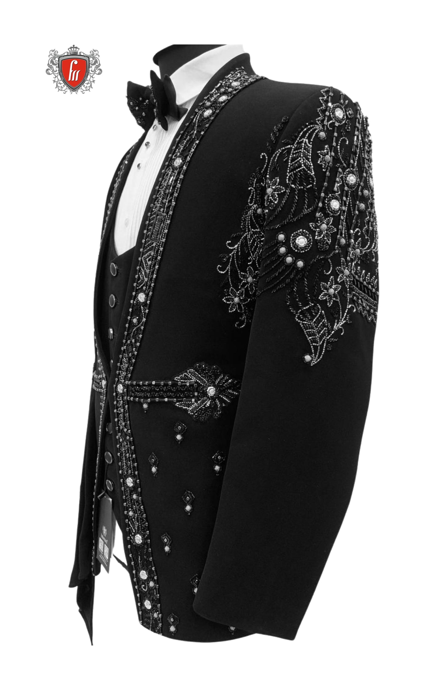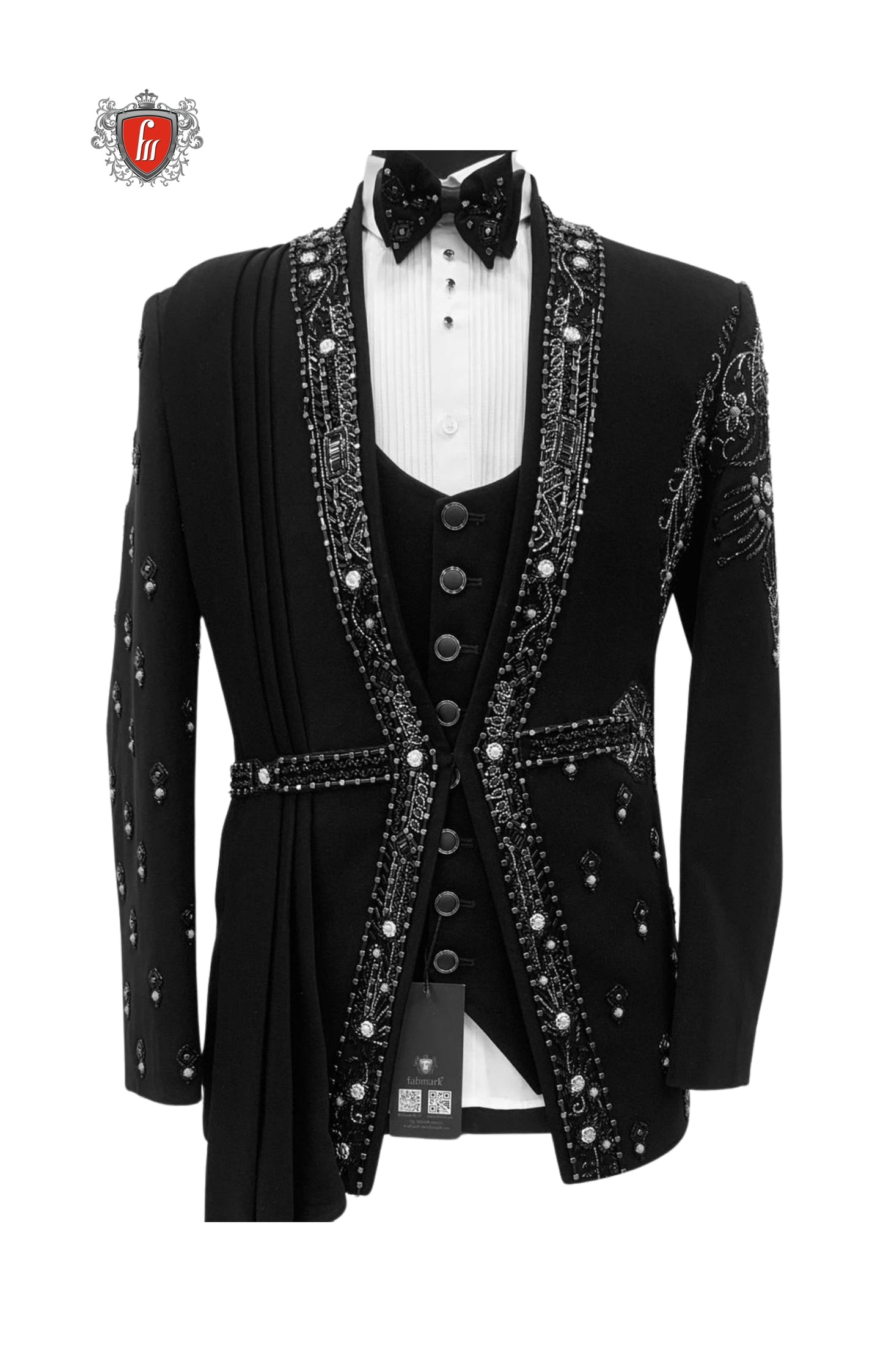 Redefine regal elegance with this stunning fusion-style tuxedo, featuring a luxurious hand-embroidered beaded border, crystal detailing, and a dramatic pleated shoulder drape. Crafted for grand occasions, this design blends the richness of a sherwani silhouette with the sophistication of western formalwear. Finished with a bold black waistcoat, embellished buttons, and a studded velvet bow tie, this outfit is perfect for grooms, receptions, or elite black-tie events.