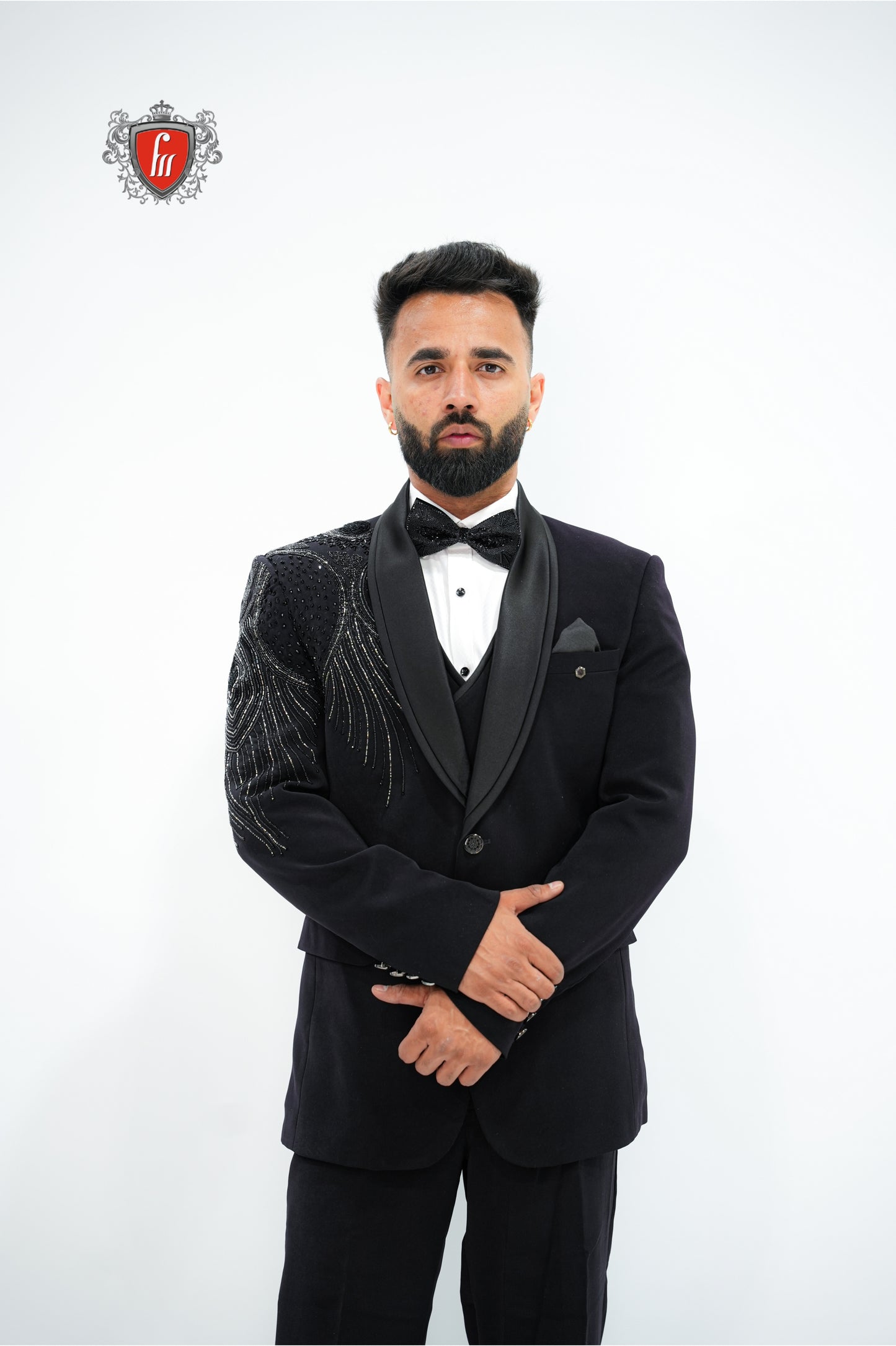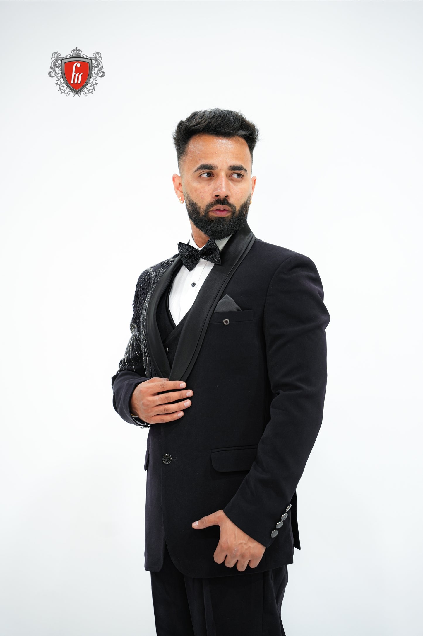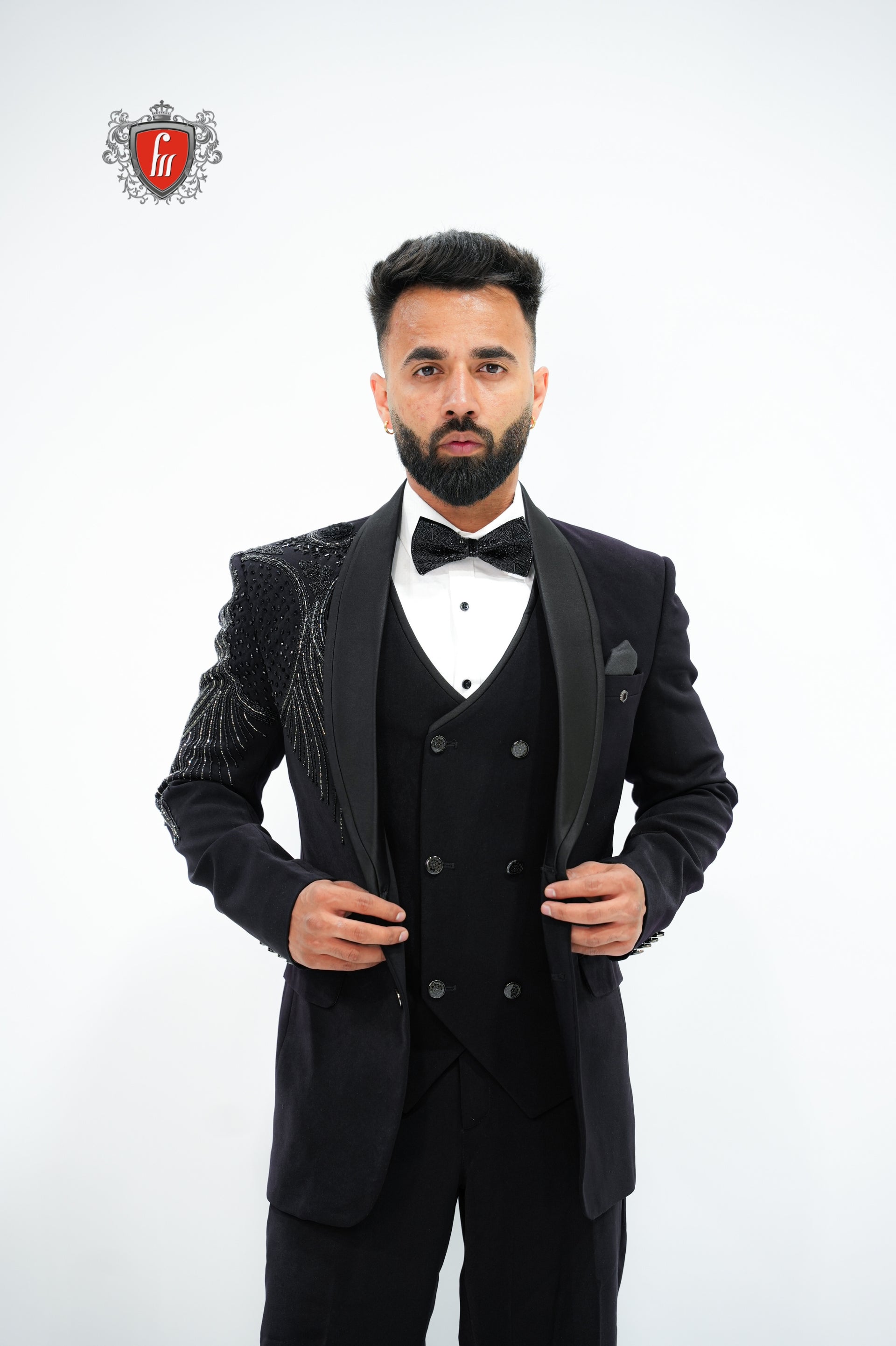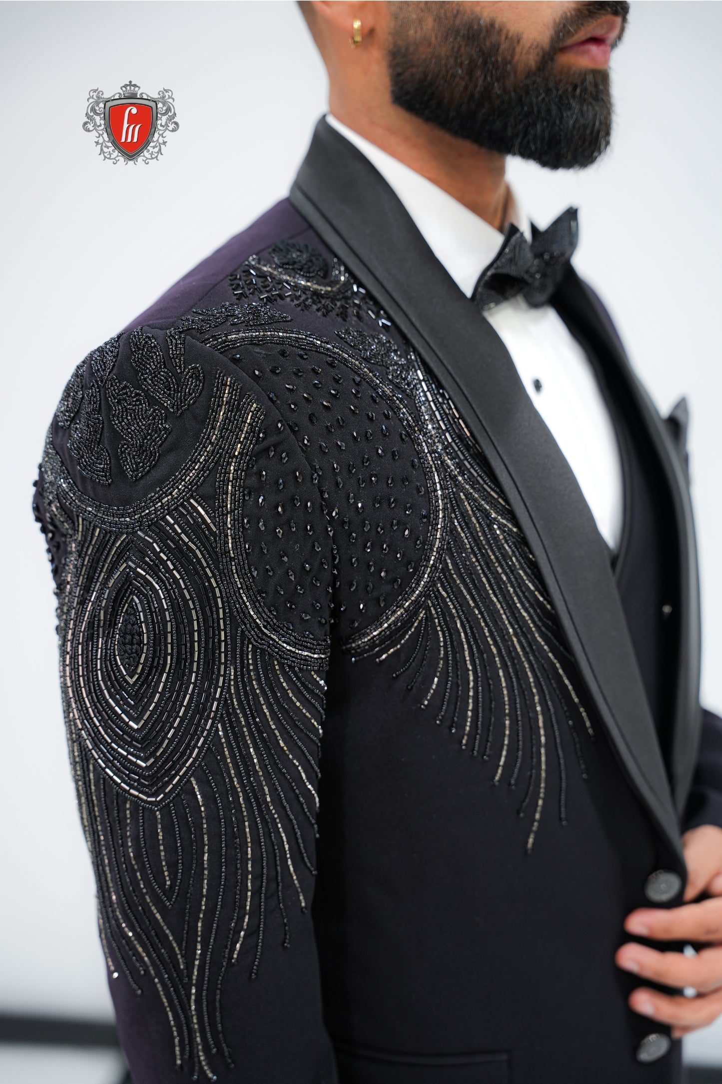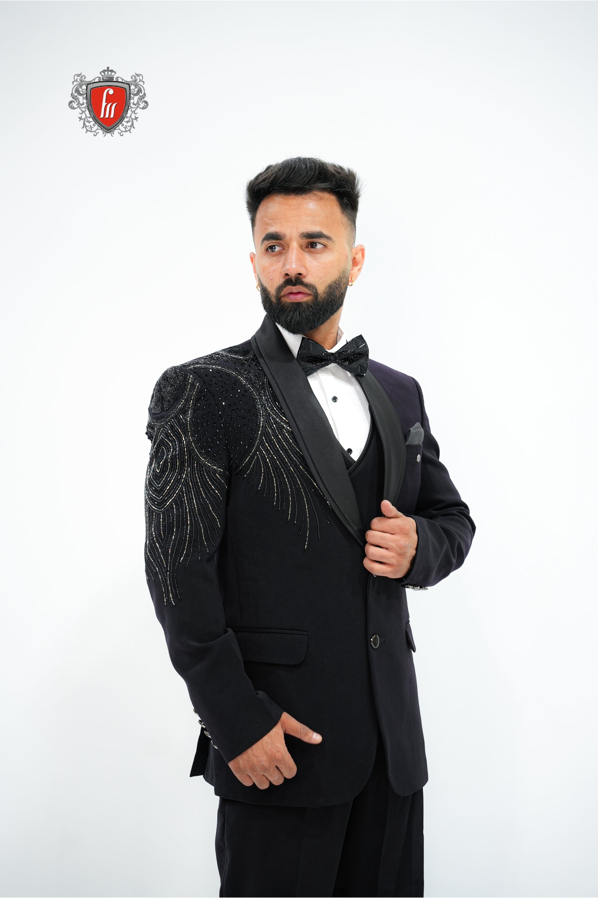 Men’s Black Tuxedo 3-Piece with Bold Bead-Worked Shoulder – Luxury Formalwear