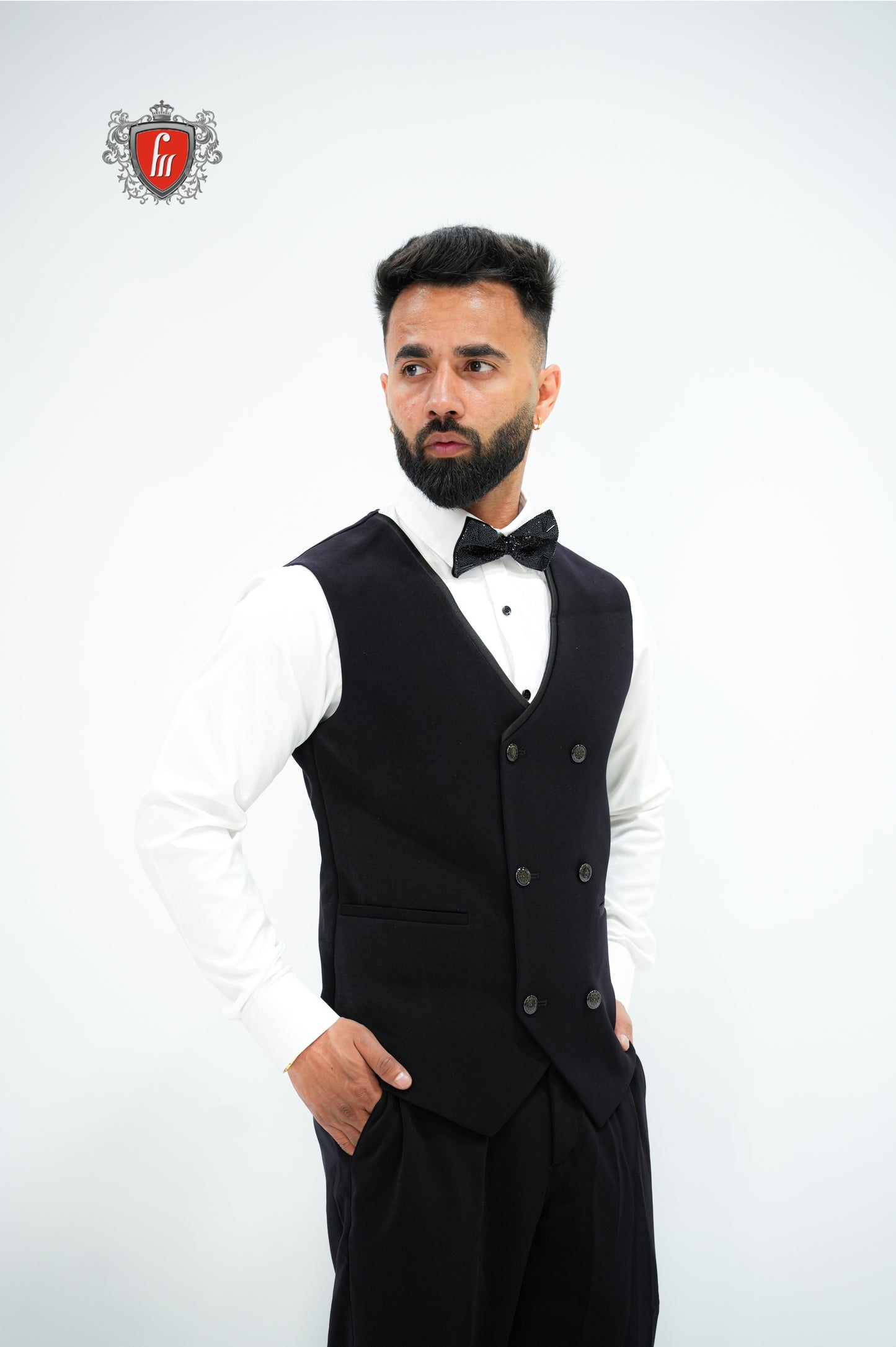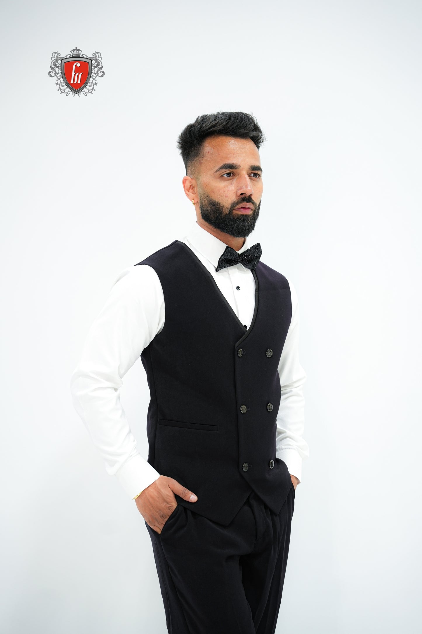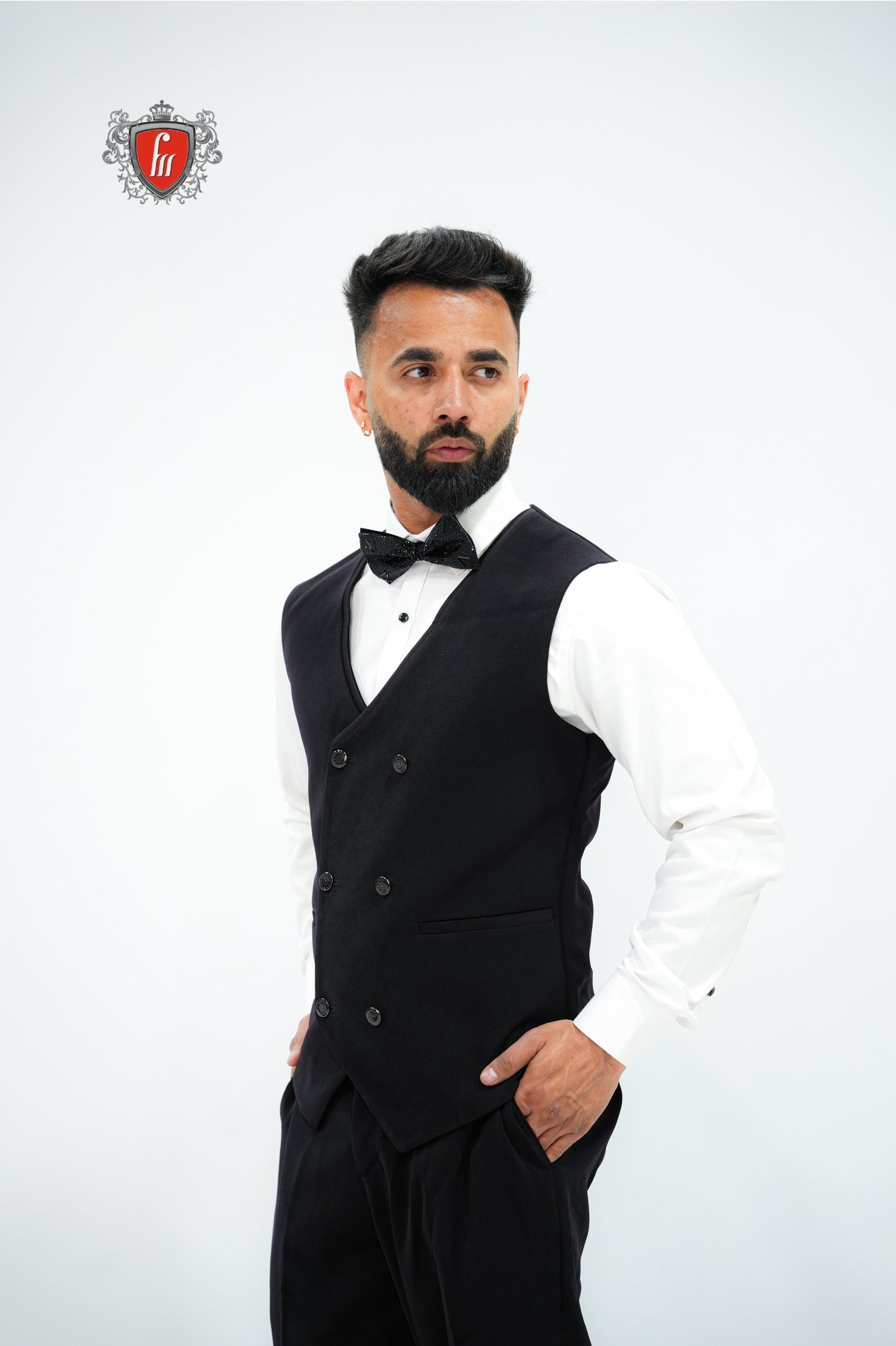 This black tuxedo adds a bold and elegant touch with its detailed bead work on one shoulder. The shiny lapel and double-breasted waistcoat give it a classy and unique vibe. Perfect for weddings, receptions, or any special event where you want to make a strong impression.