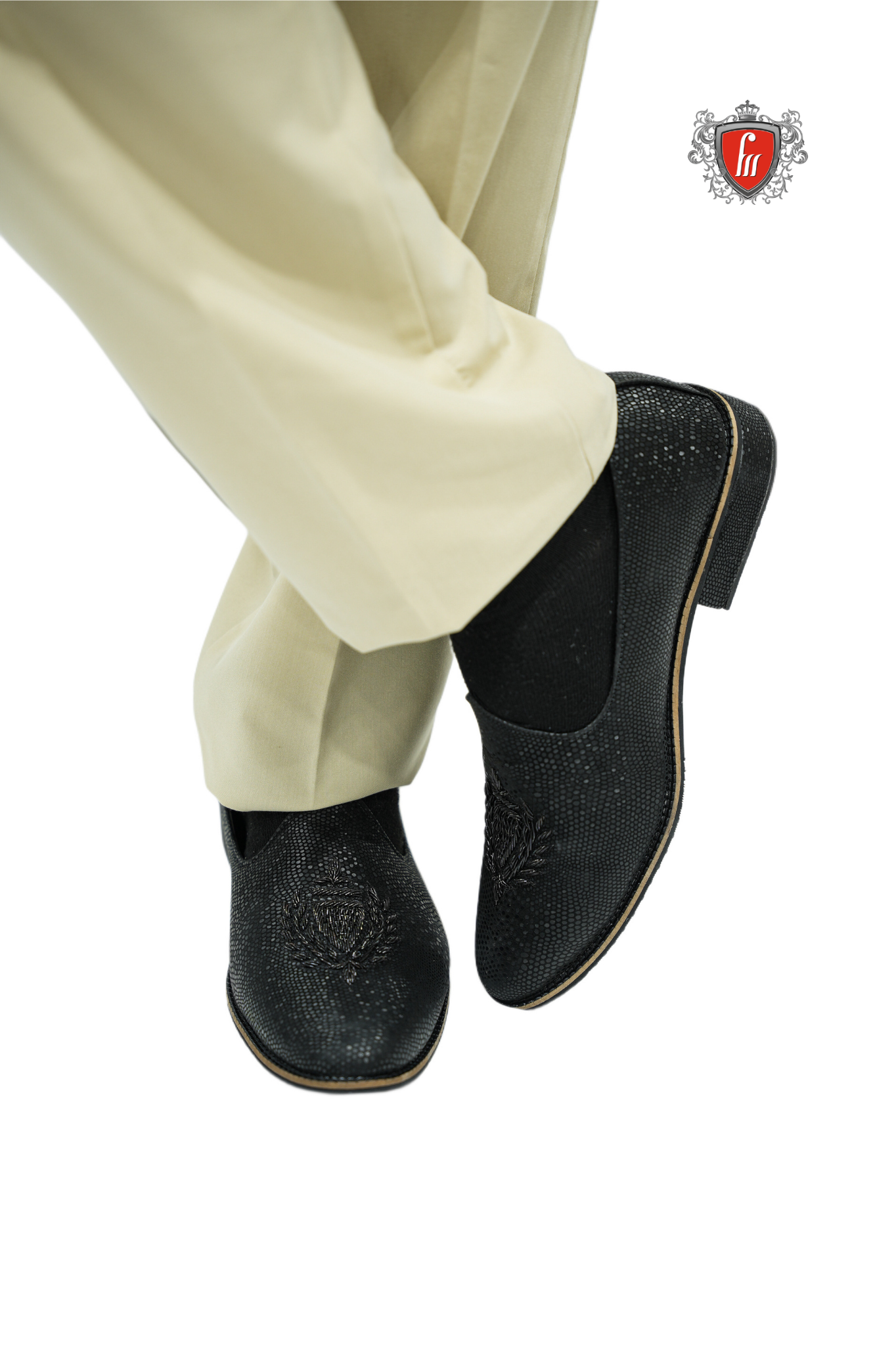 Bring a touch of refined elegance to your ethnic wardrobe with these black textured ethnic loafers. Crafted with a premium faux leather base and subtle black-on-black embroidered crest, these loafers blend minimalism with royal charm. The sleek silhouette and slip-on comfort make them a perfect match for both festive kurtas and formal Indo-western outfits.