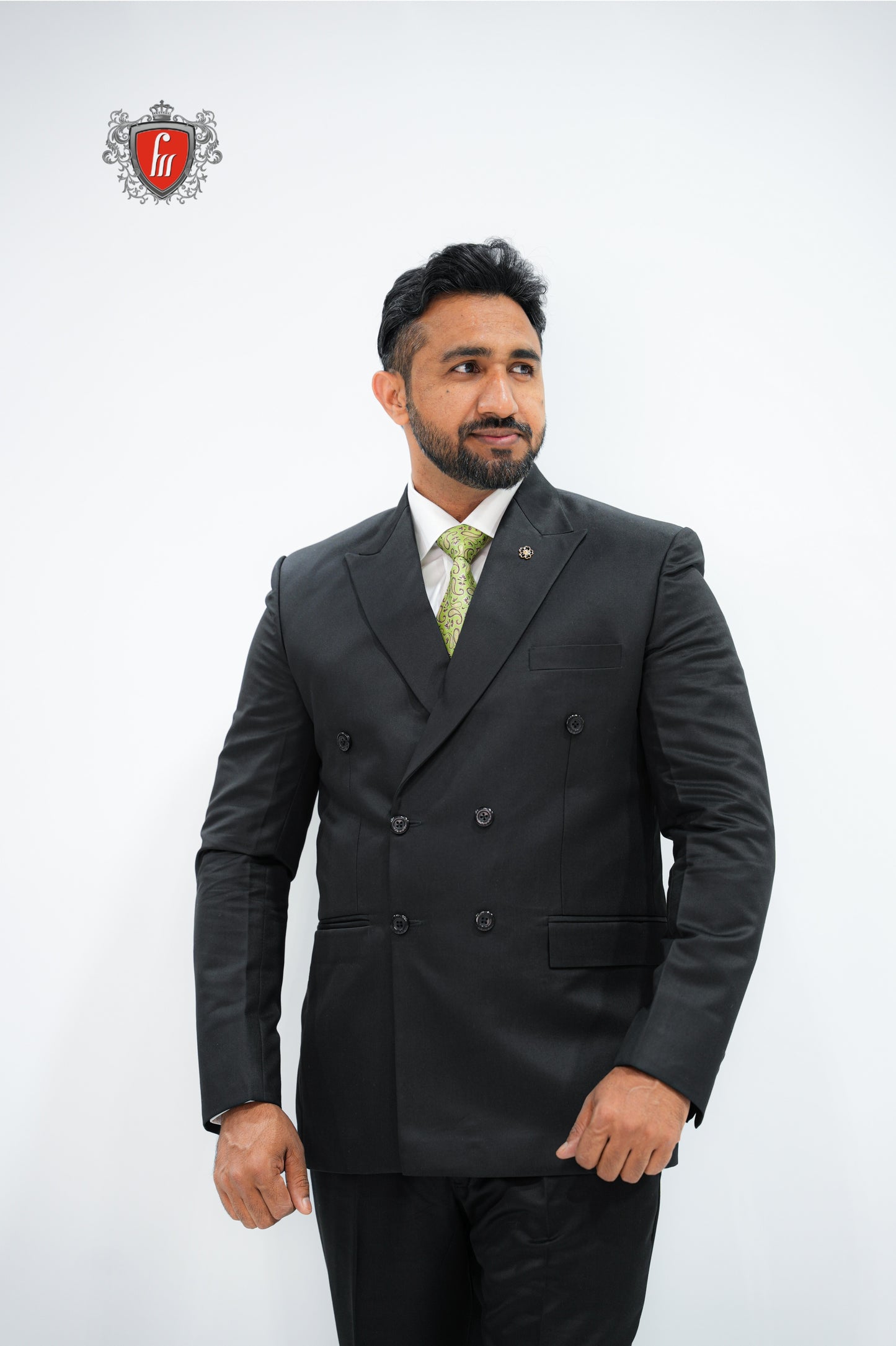 - Premium black double-breasted suit