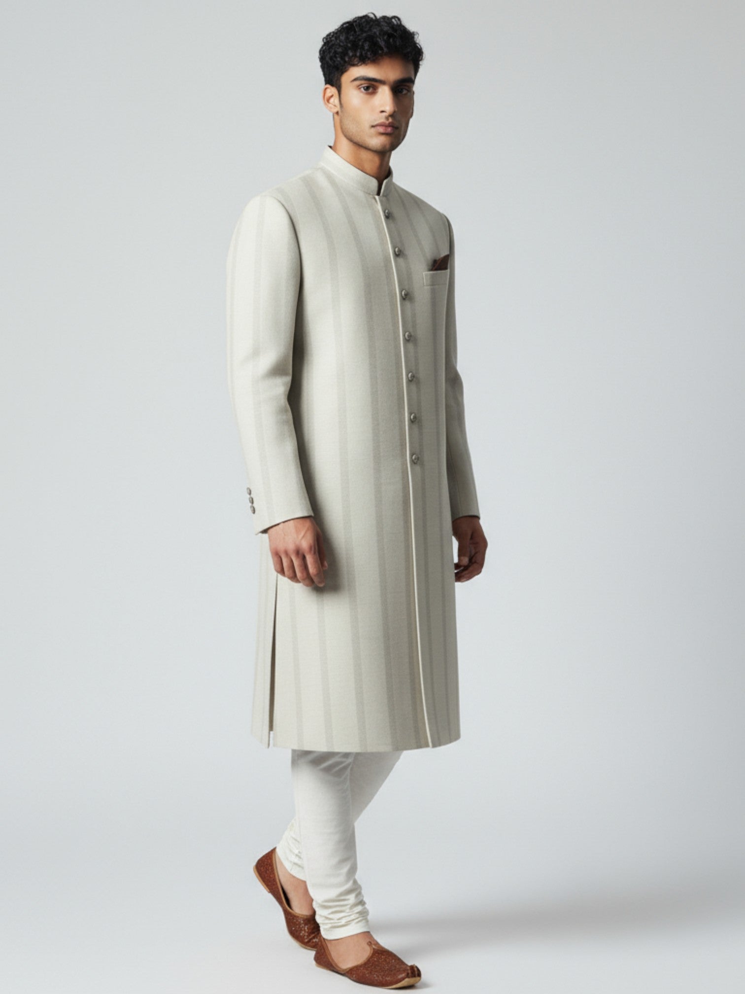 Silver Striped Achkan for Men – Elegant Wedding & Festive Wear