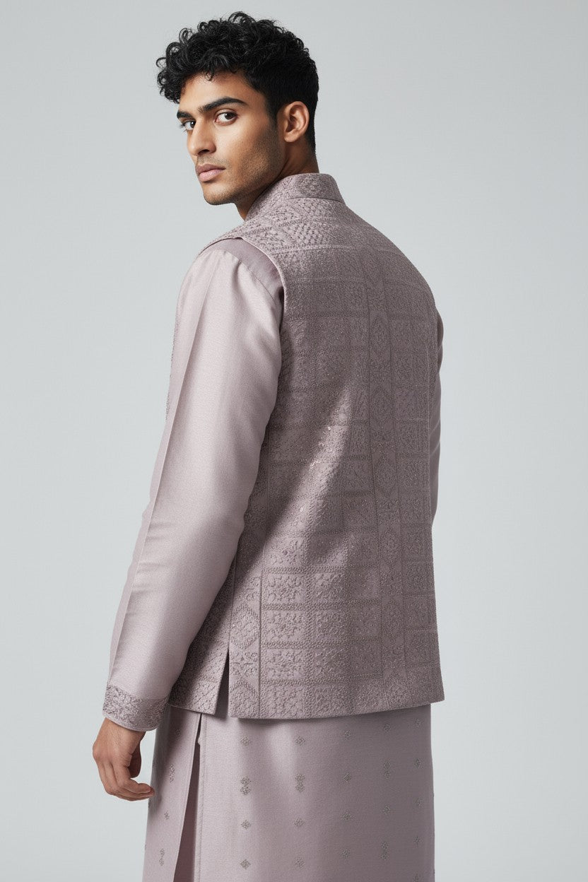 Step into elegant sophistication with this Lavender 3-Piece Kurta Set, crafted for men who appreciate refined pastel tones and premium ethnic design. This luxurious ensemble includes a soft lavender kurta, matching bottoms, and an intricately embroidered jacket featuring geometric motifs, textured threadwork, and tonal embellishments. The muted lavender hue offers a graceful, contemporary look while maintaining classic cultural charm.