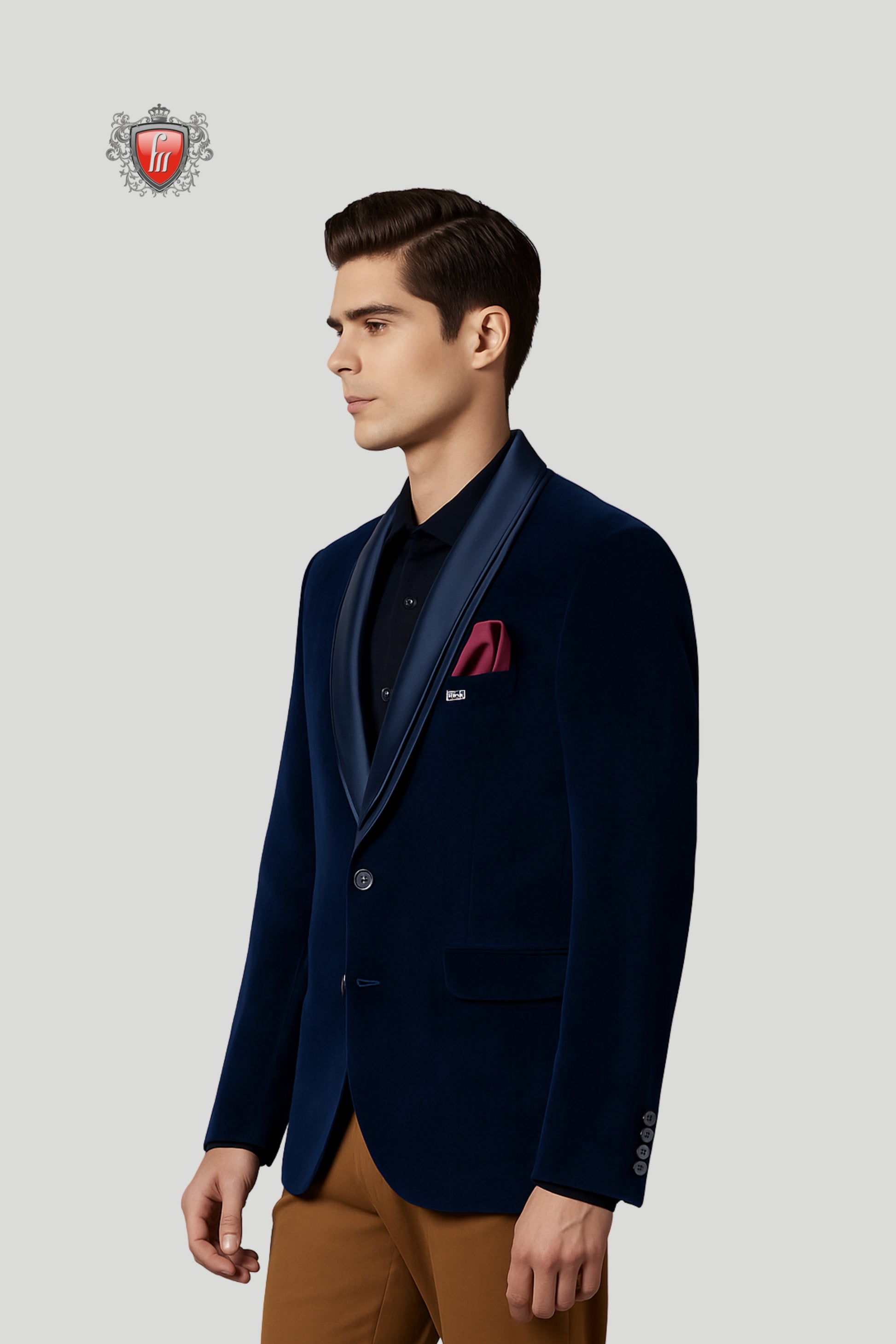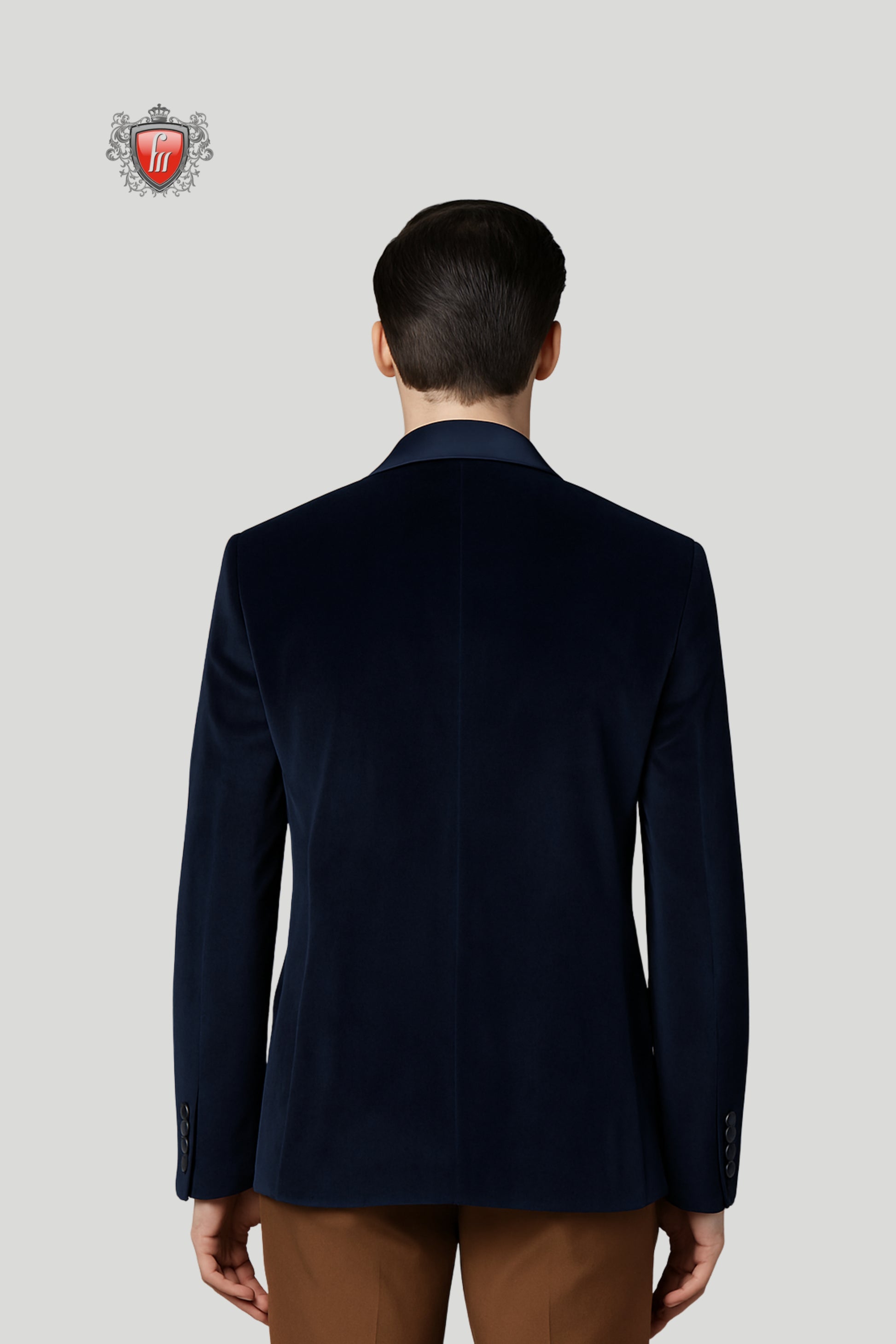 Men’s Navy Blue Velvet Blazer – Luxurious Eveningwear with Satin Lapels