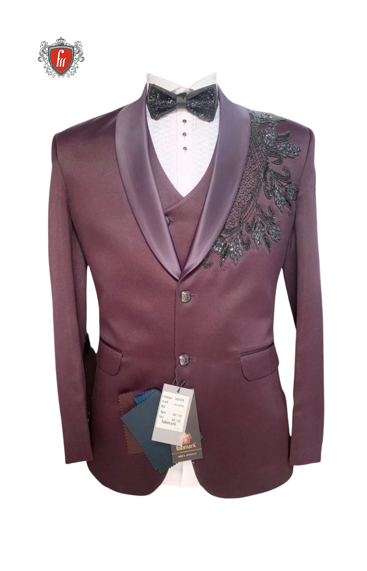 Turn heads in this elegant plum tuxedo, crafted in luxurious satin with a sleek shawl lapel and a tonal embroidered floral motif on one shoulder. The rich texture and subtle sheen give it a premium finish, while the matching waistcoat and beaded bow tie add layers of sophistication. A perfect choice for evening receptions, formal gatherings, or groom wear with a modern twist.