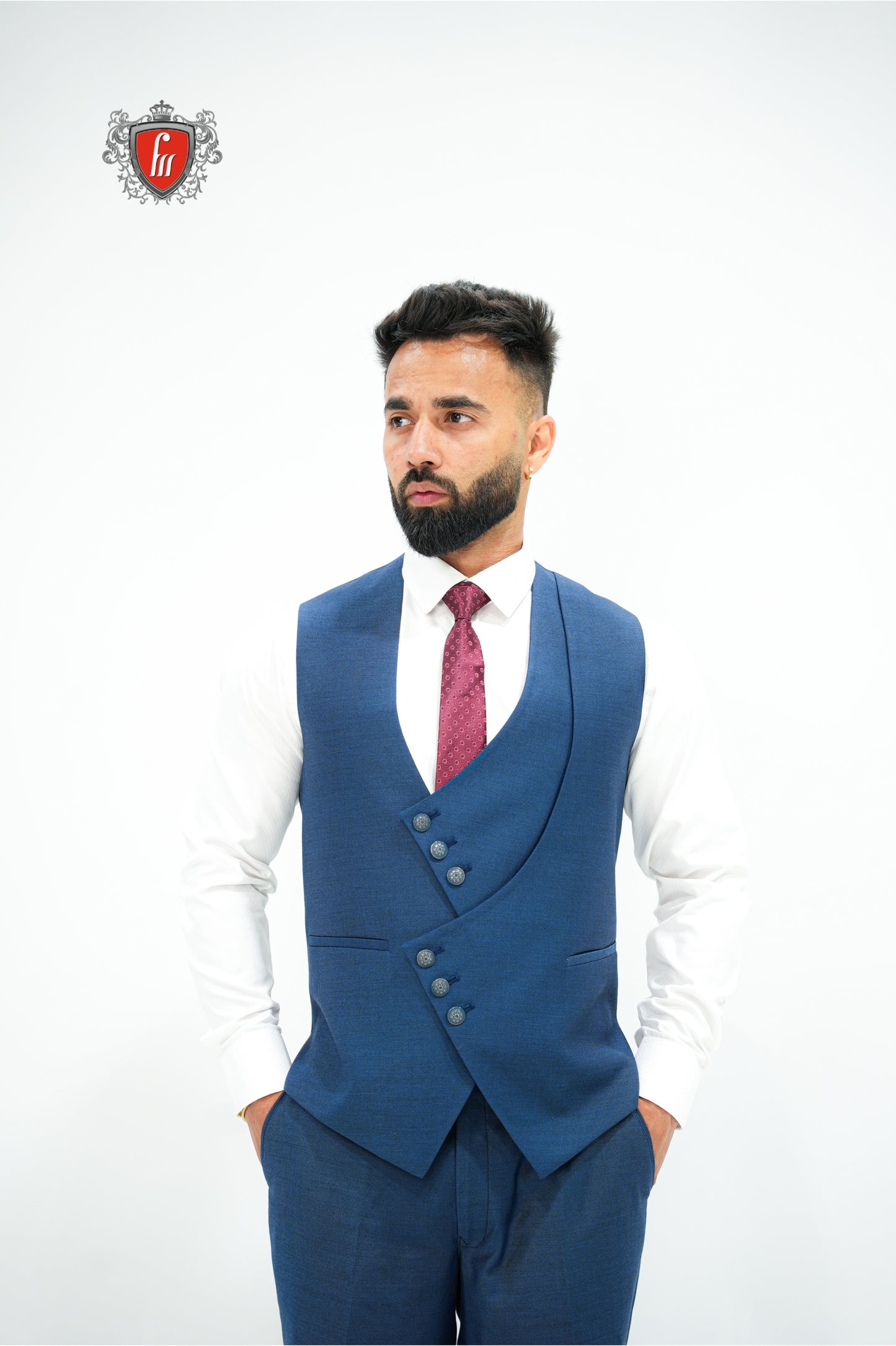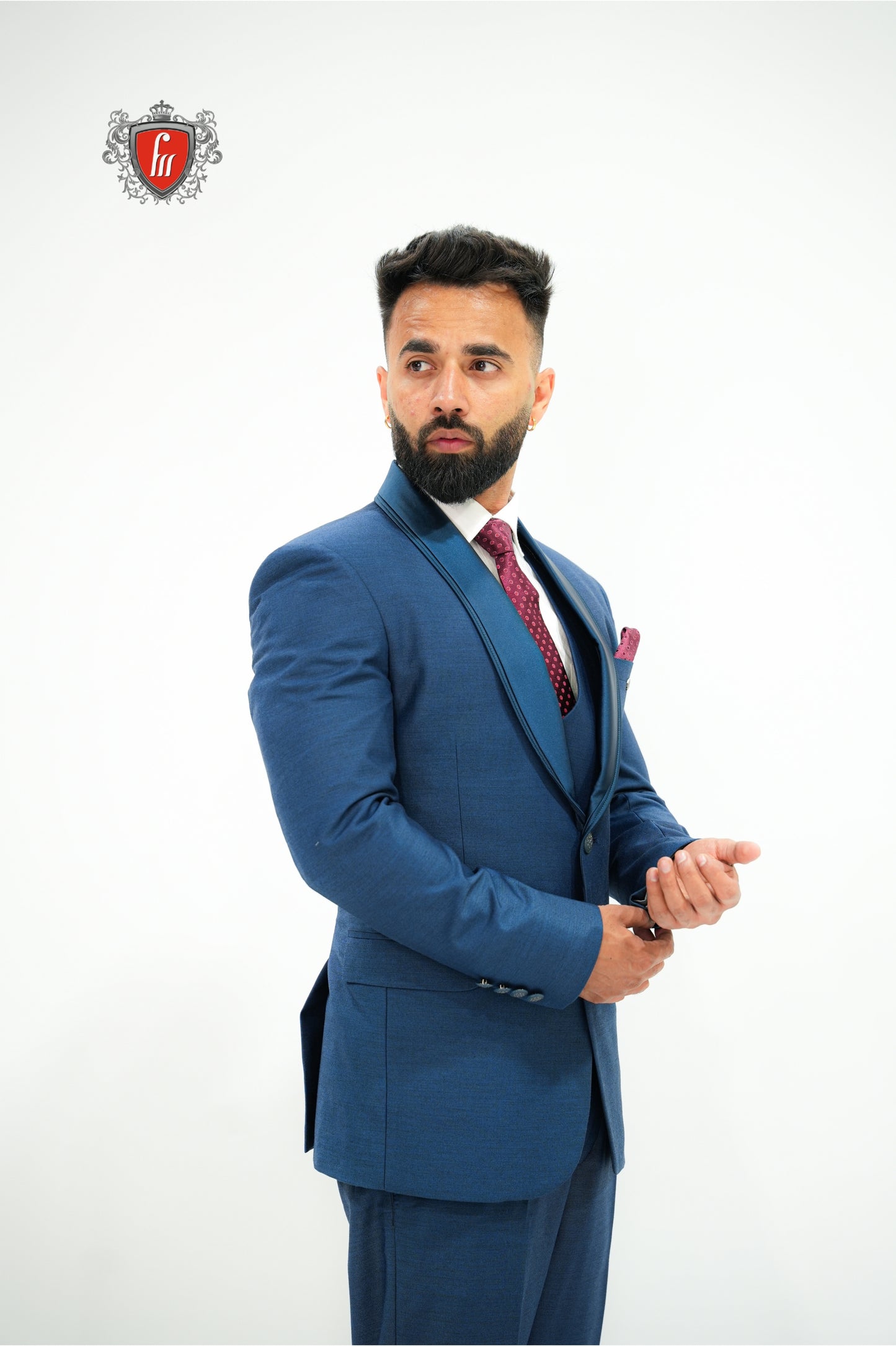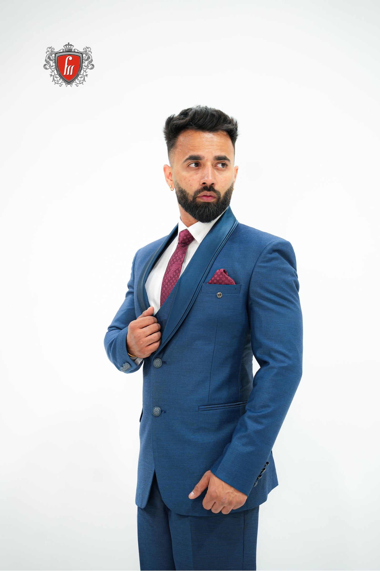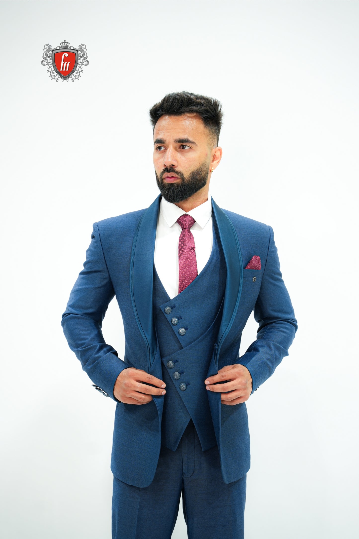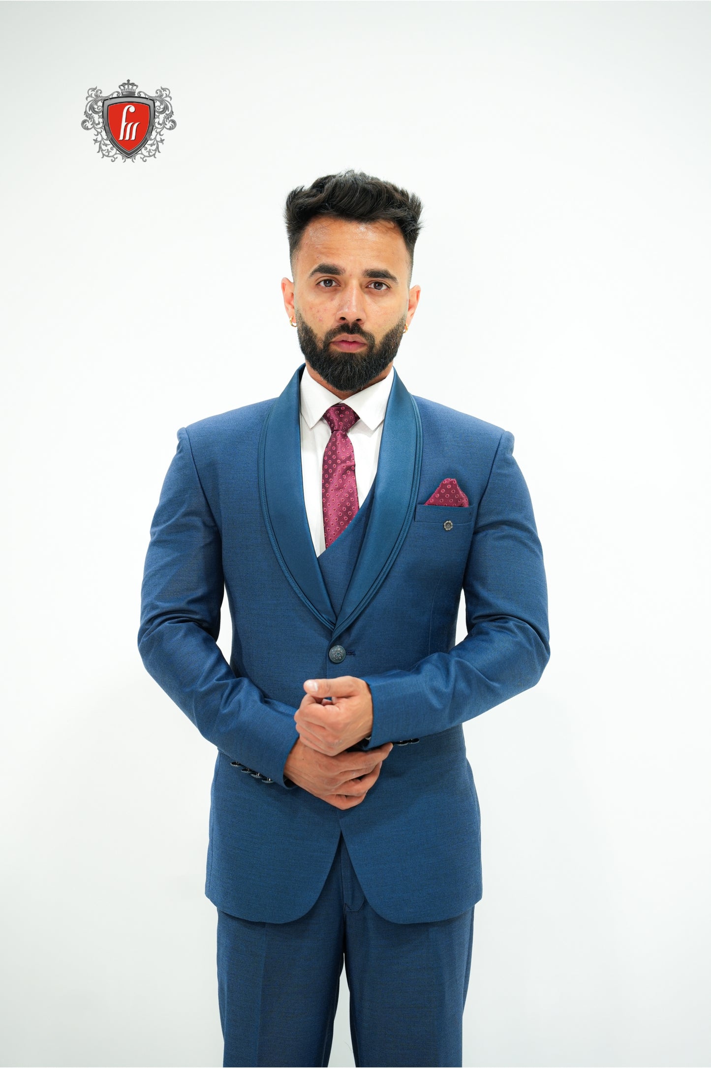 Crafted for grand occasions, this royal blue suit blends tradition with modern sophistication. The satin shawl collar creates a luxurious finish against the rich blue fabric. A perfectly fitted waistcoat keeps the look sharp and balanced. Moreover, the maroon tie breaks the monotony, adding a bold, striking contrast. Every stitch is tailored to perfection, ensuring a sleek silhouette. From weddings to formal evenings, it adapts effortlessly. A perfect balance of modern vibe and timeless sophistication.