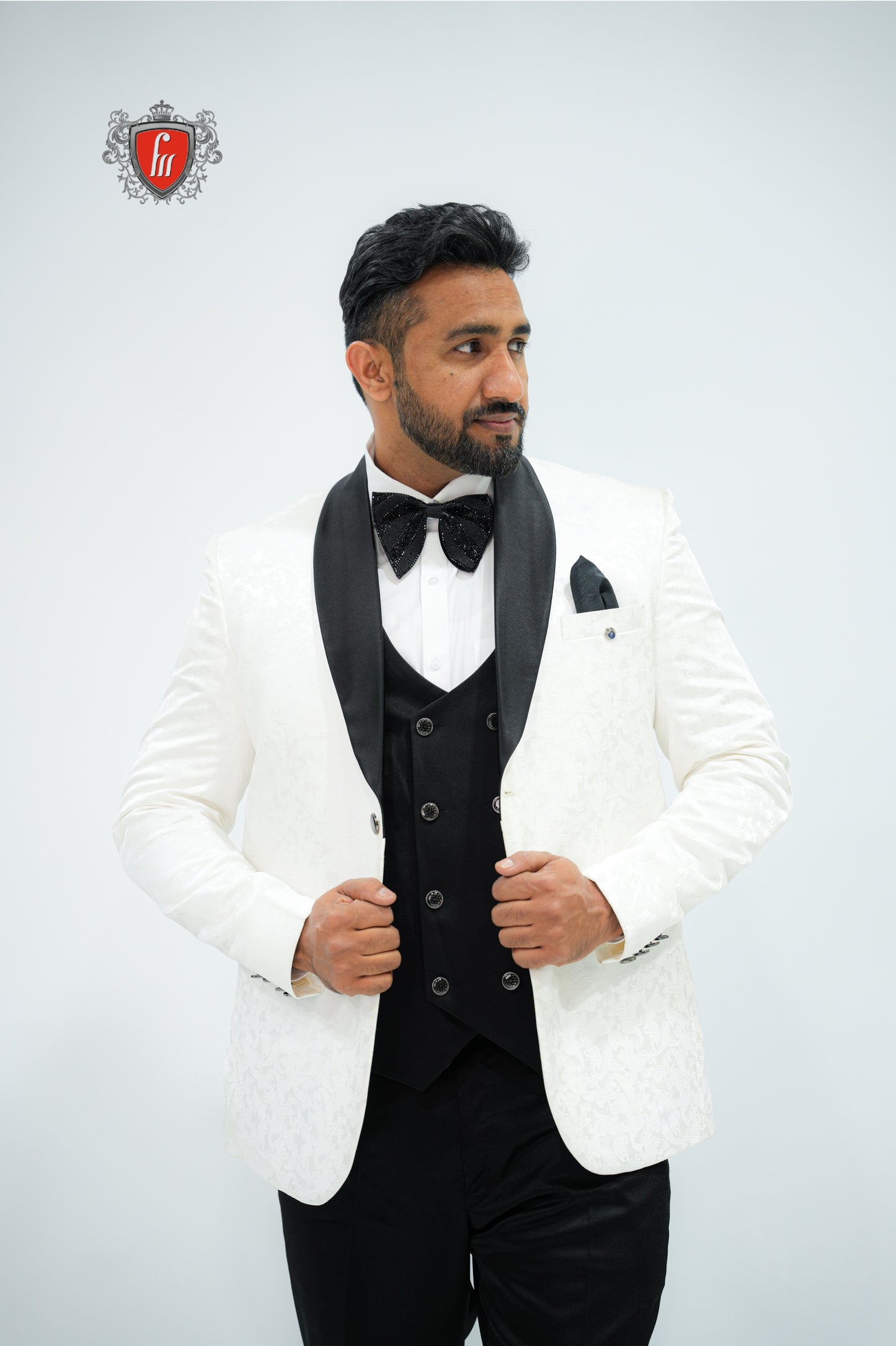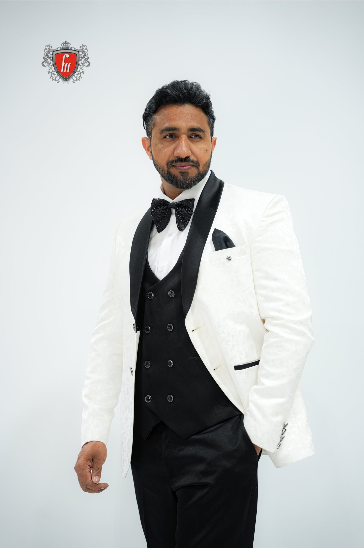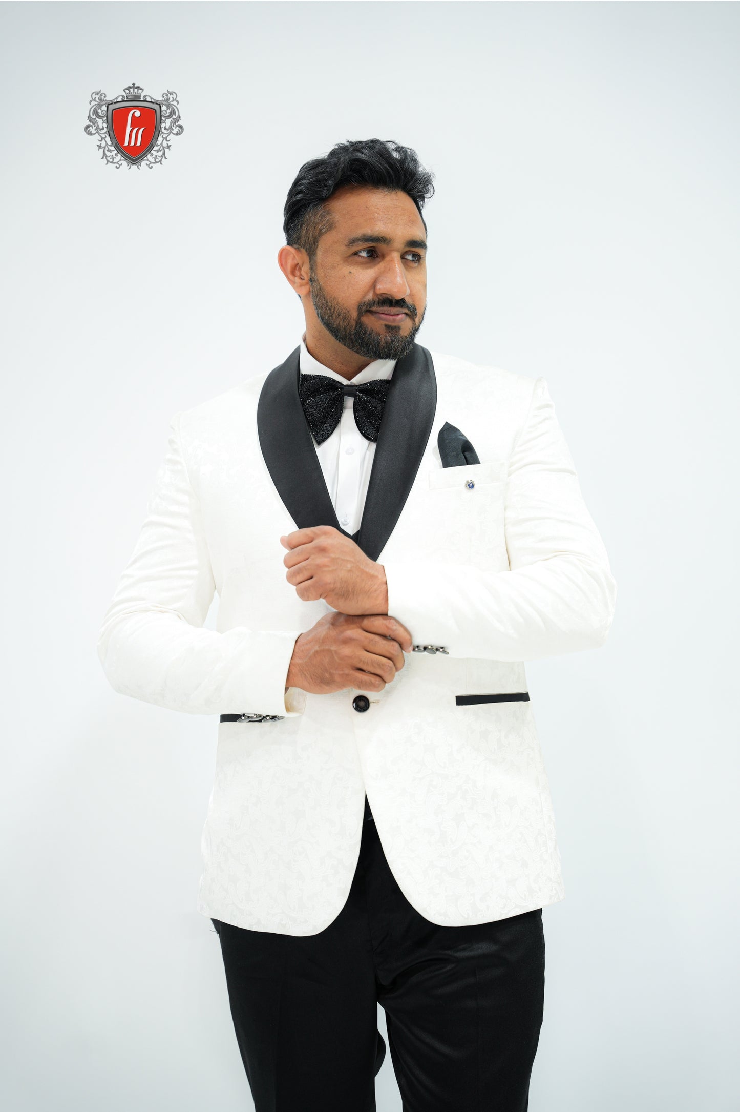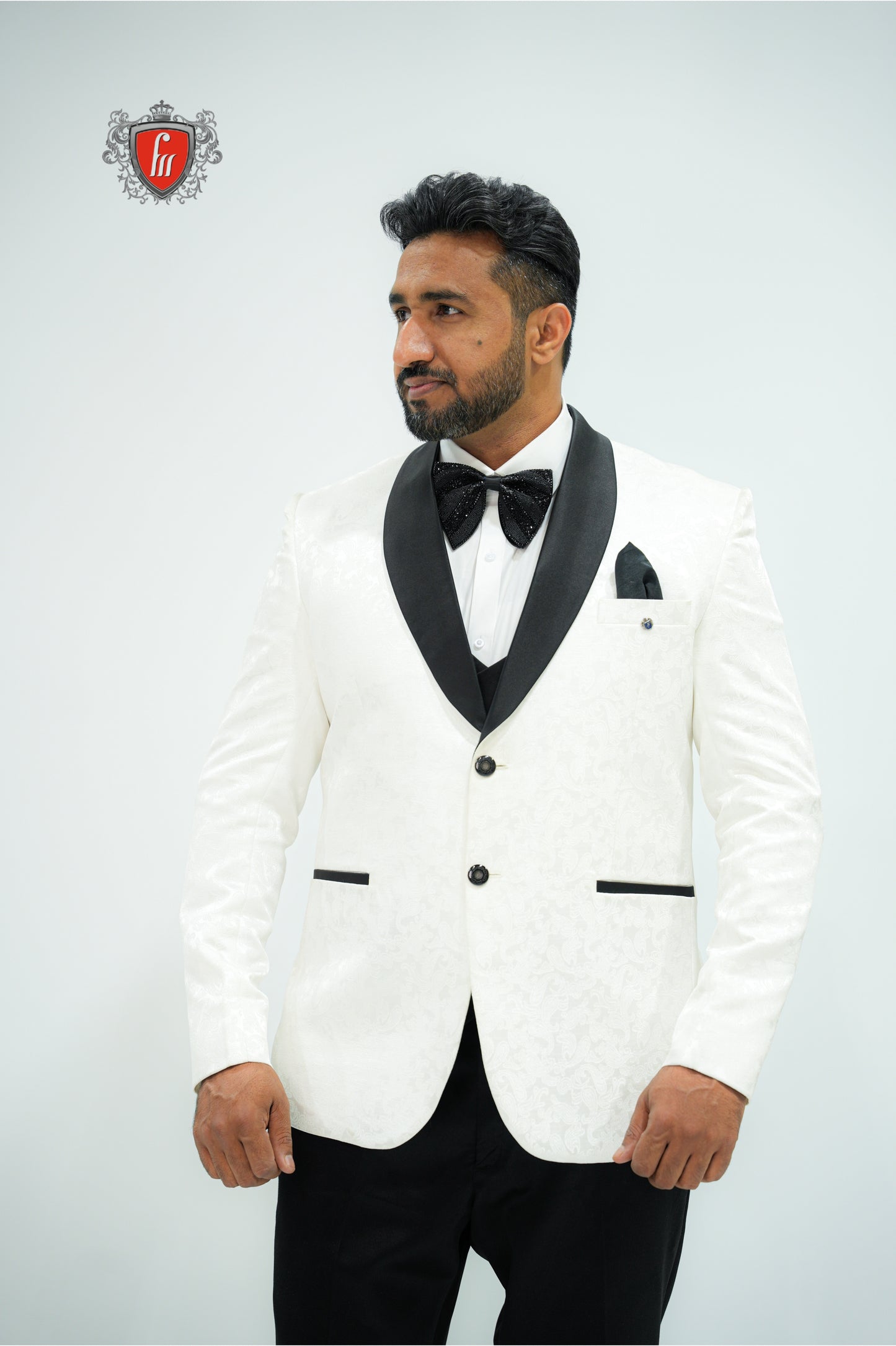 Step into timeless sophistication with this White Tuxedo Suit for Men, featuring a luxurious black satin lapel, classic black bow tie, and crisp detailing. Perfect for weddings, receptions, and formal evening events, this suit blends traditional elegance with modern style. The subtle pattern on the fabric adds a refined touch, making it ideal for grooms or anyone aiming to make a sharp impression.